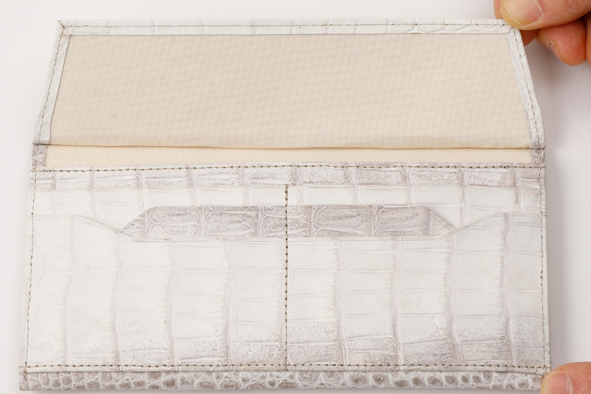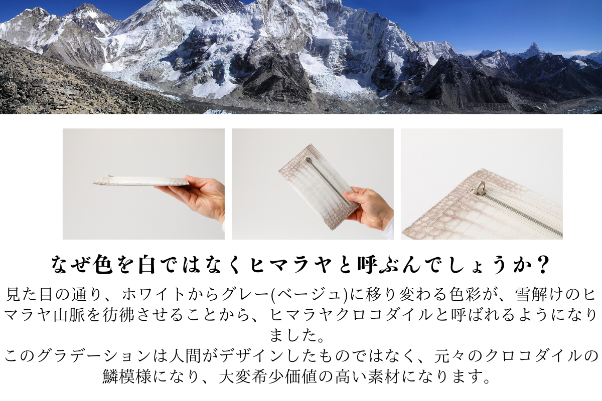 ・革素材に関して クロコダイルは斑柄と呼ばれる立体感のある柄が特徴ですが、1枚1枚斑柄が異なります。ヒマラヤクロコダイル場合、染色されたものではなく天然のもののため、1点1点表情が異なります。 天然クロコダイル革ならではの個性としてご理解ください。