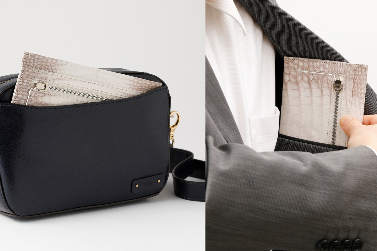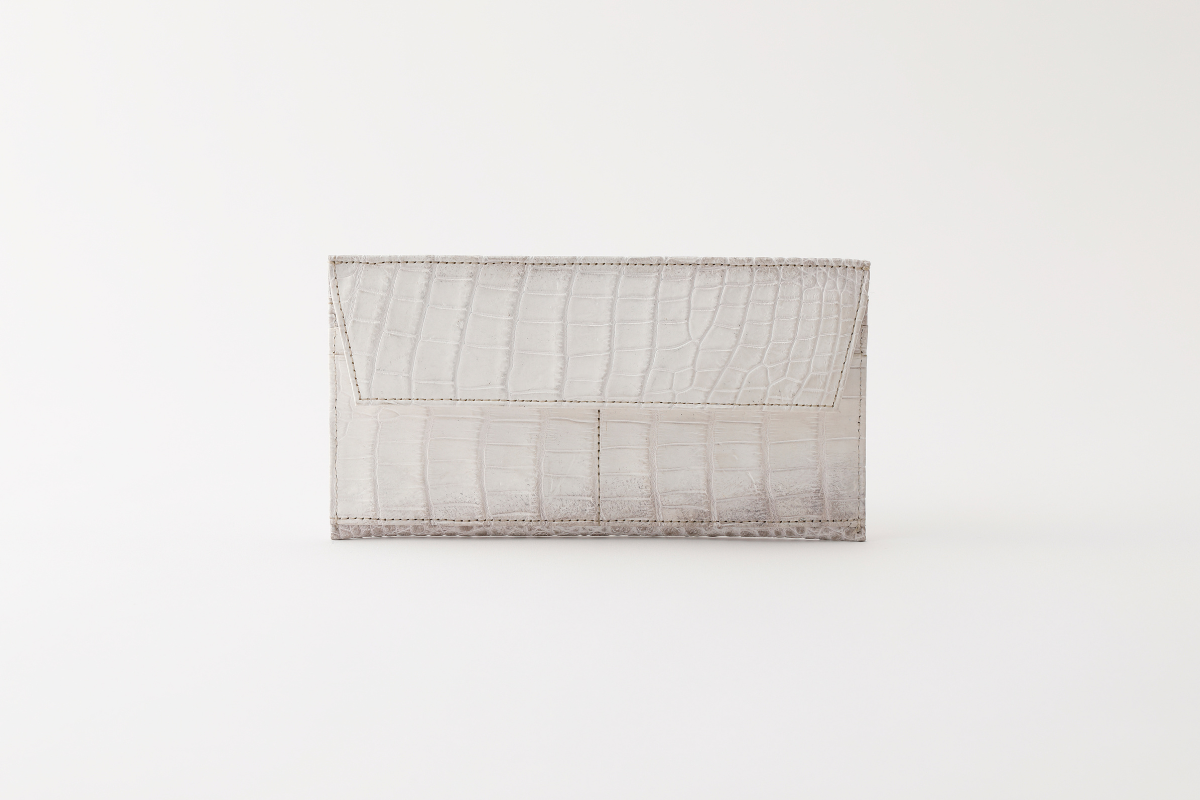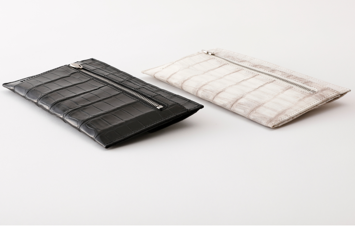 センター取りで上品さと高級感を表現し、横取りでは、カジュアルでありながらも、素材はクロコの高級品種というのが「ぜいたくの極み」だと思っています。