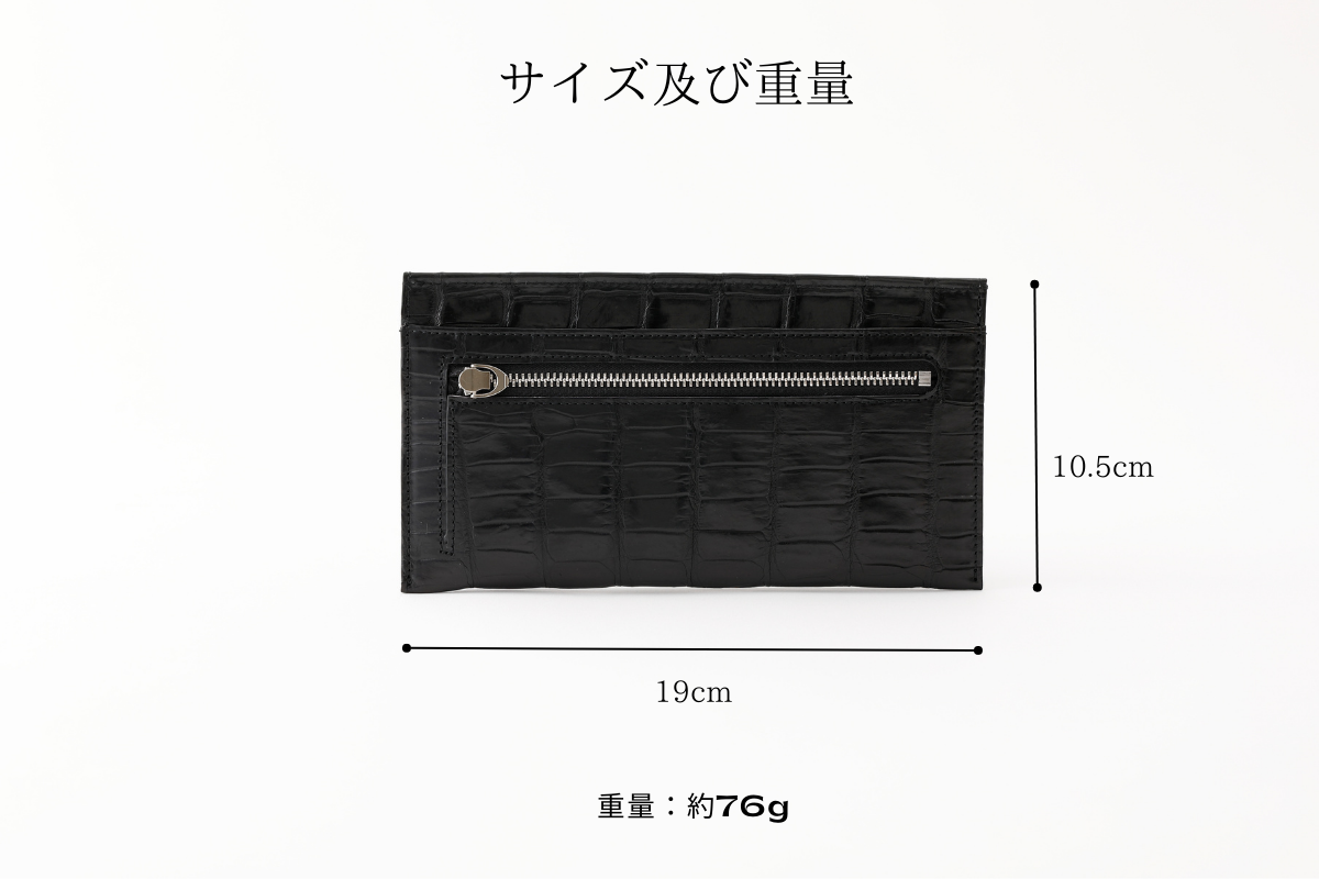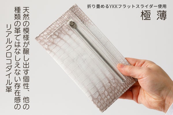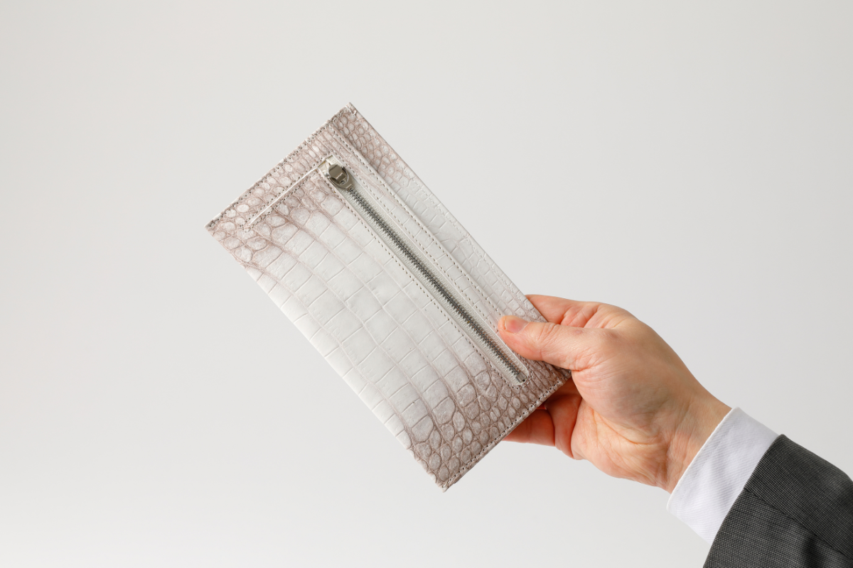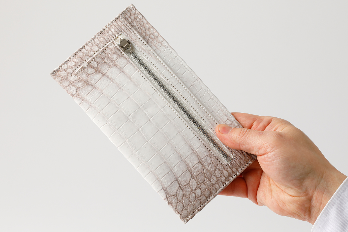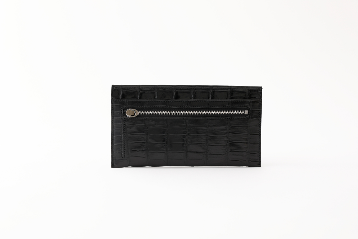 ファスナーはシルバーカラーで、クロコダイルに美しく映えます。