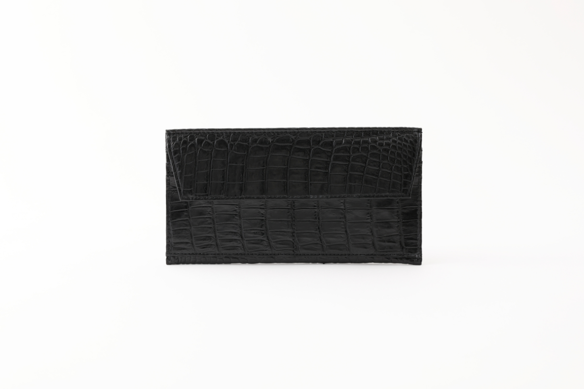 クロコ革の中心(センター)を財布の中心に合わせて、四角いウロコ(竹斑)と丸いウロコ(玉斑)がバランス良く左右対称となる上品で美しいスタイルです。