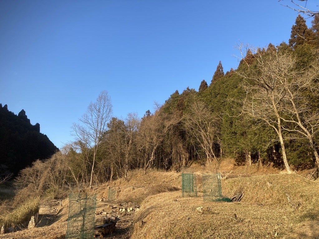 昨年、農の匠で学び、接木した苗を五本植えました。まだ小さいので対処療法で木の周りだけを囲い、一年後には柵をしないとダメだとわかりながらも・・・この広範囲どうしたらいいだろうと悩みあぐねてきました。