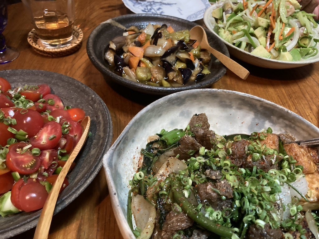 田畑は、農薬や化学肥料を使わずに、周りにある草花やお米を脱穀した後の籾殻や牡蠣殻等を使って「土づくり」から行い、ミネラルやエネルギーあふれる子どもたちがパクパク食べちゃういのちのエネルギーに満ちたお野菜をセットにしてお届けしながら、宿のお食事としても提供させていただいています。
