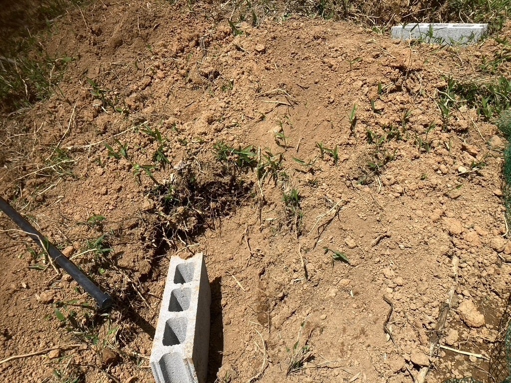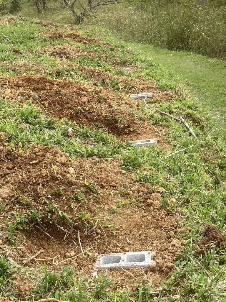 3つの穴の二つは鉄筋を入れるので土を入れないようにして