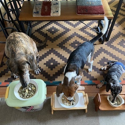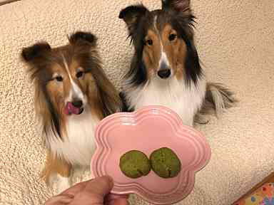 オンラインショップ販売の薬膳食材入りのおやつを食べるワンちゃん達。ご購入の飼い主さんが送ってくださいました。