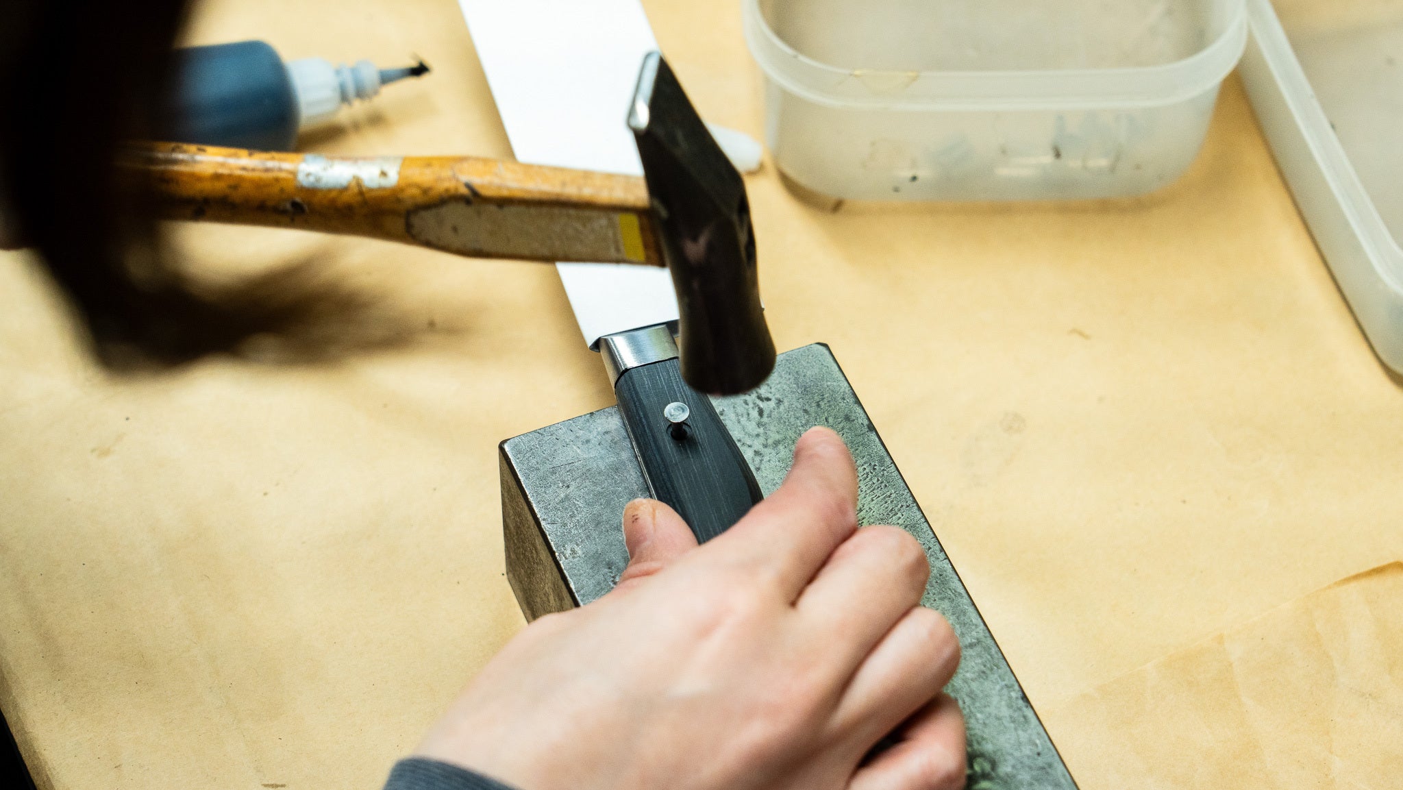 包丁の重心を口金を中心にバランスを取ることで、まな板の上で切る時も、包丁を持って剥くなどの作業をするときにも疲れにくいように考えています。 口金はそのバランスを取るための役割はもちろん、持ちやすさや汚れにくさにも関係する 大切なパーツです。 一見地味なパーツですが、職人が手作業で非常に緻密な作業で時間をかけて仕上げています。