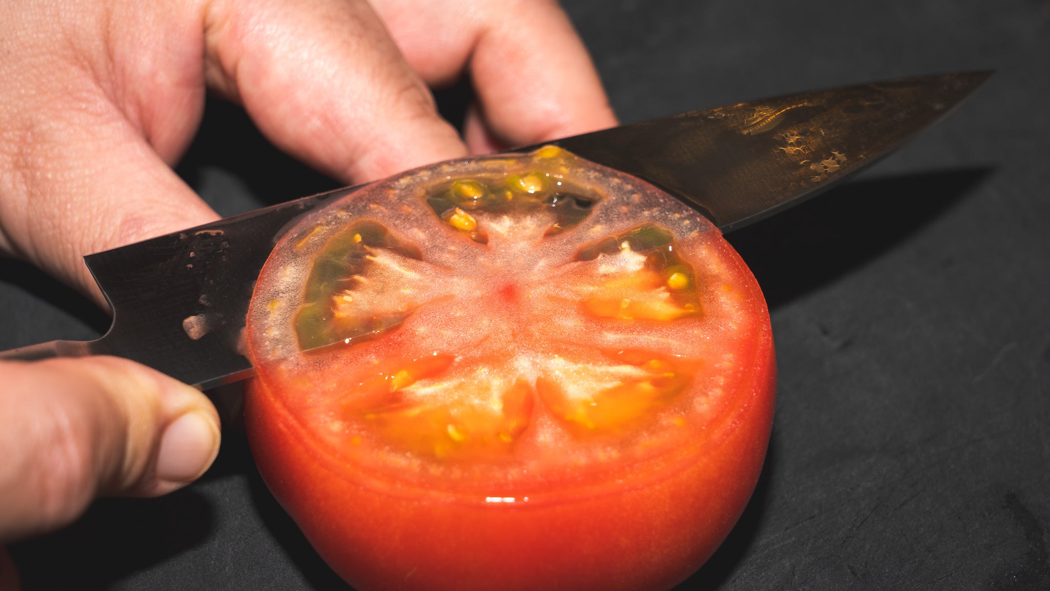切れ味の良い包丁で切ったトマトは、断面がざらざらしていなくて、味わいがクリアです。
