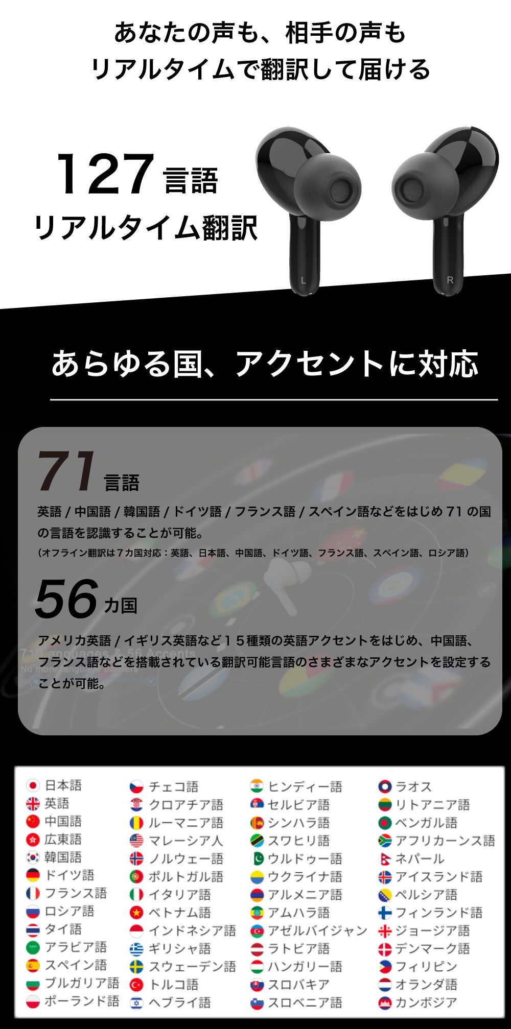 71カ国に加えて56の方言アクセントに対応。様々な言語に対応します。