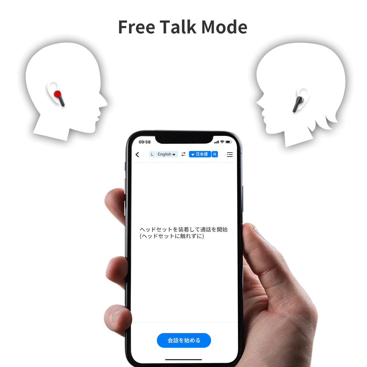 イヤホンをつけたままスマートフォンに向かって話してもらうだけで、翻訳された音声がイヤホンにリアルタイムで再生されます。