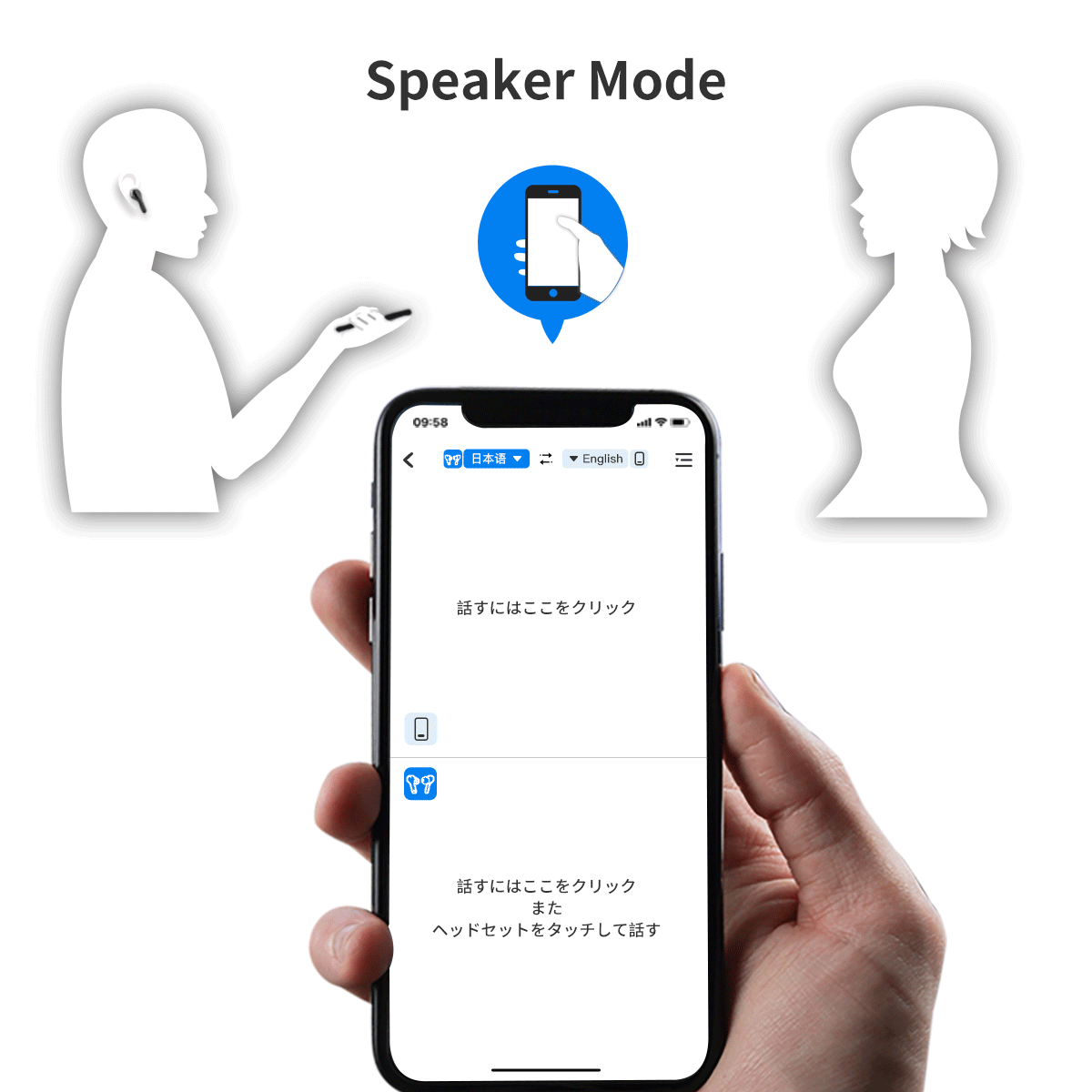 イヤホンをつけたままスマートフォンに向かって話してもらうだけで(PCからの音声をスマホに向けるだけ) 、翻訳された音声がイヤホンにリアルタイムで再生されます。