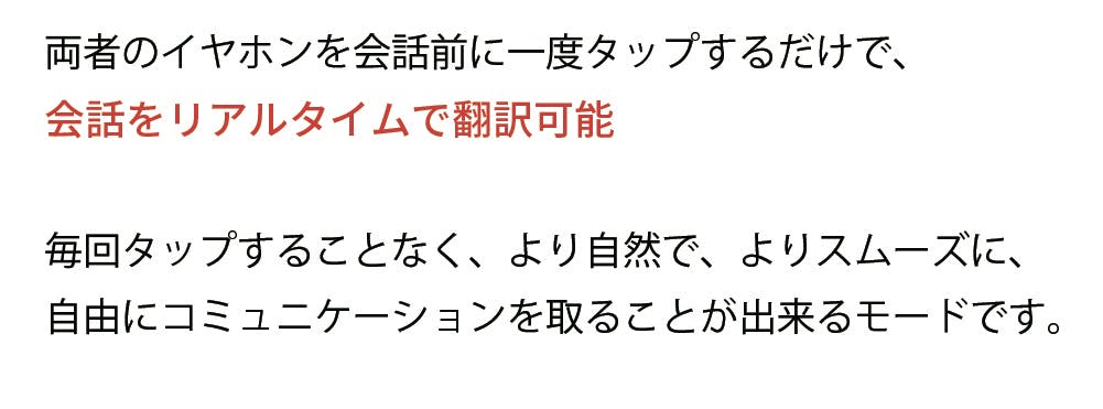 イヤホンをつけたままスマートフォンに向かって話してもらうだけで、翻訳された音声がイヤホンにリアルタイムで再生されます。