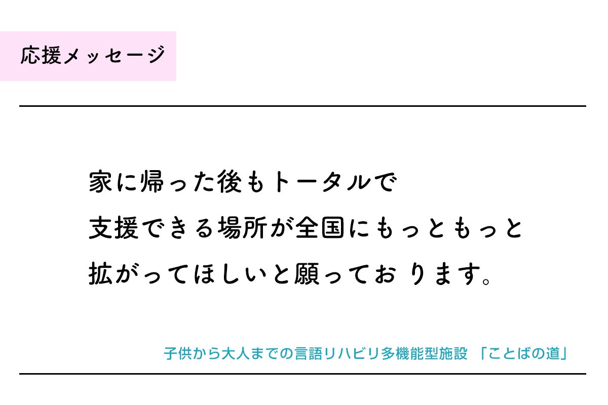 目に見えない障がいであるがゆえに認知度も低く、支援体制もまだまだ不十分ですが、家に帰った後もトータルで支援できる場所が全国にもっともっと拡がってほしいと願ってお ります。