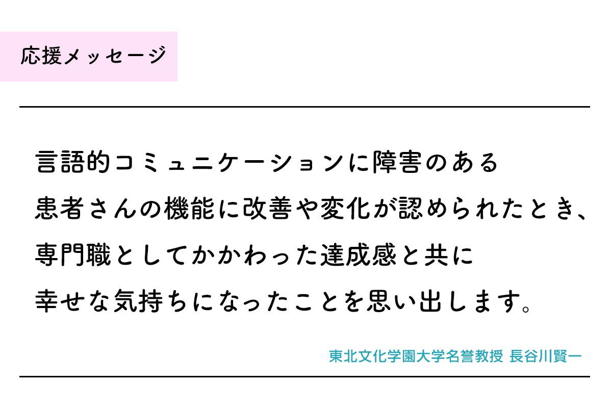 言語的コミュニケーションに障害のある患者さんの機能に改善や変化が認められたとき、専門職としてかかわった達成感と共に幸せな気持ちになったことを思い出します。