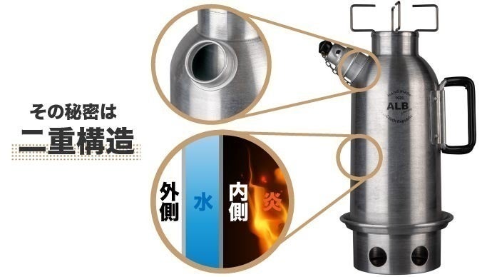 外壁と内壁の間に水を注ぎ、空洞となった内側に火を焚くことで、内側全体から加熱可能です。
