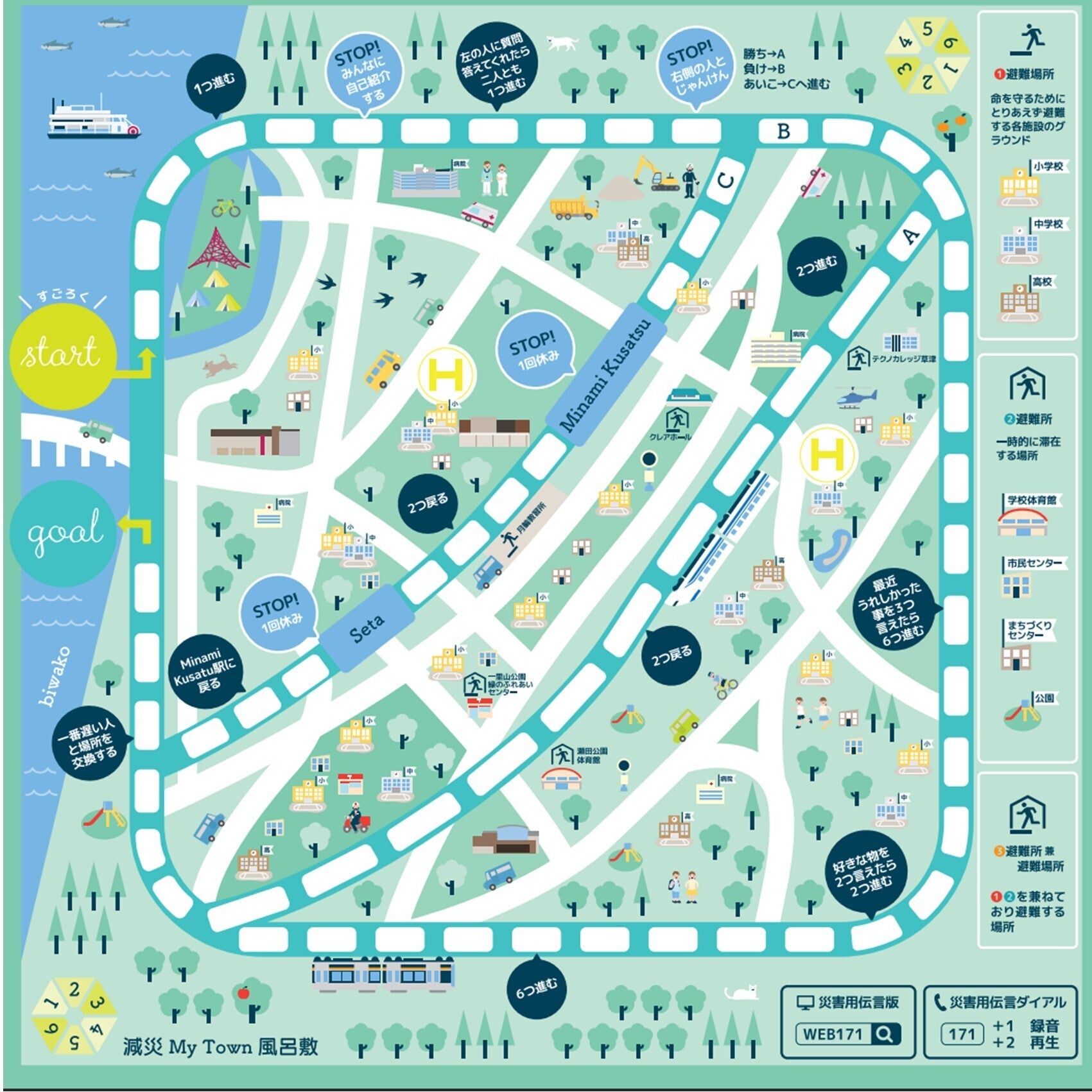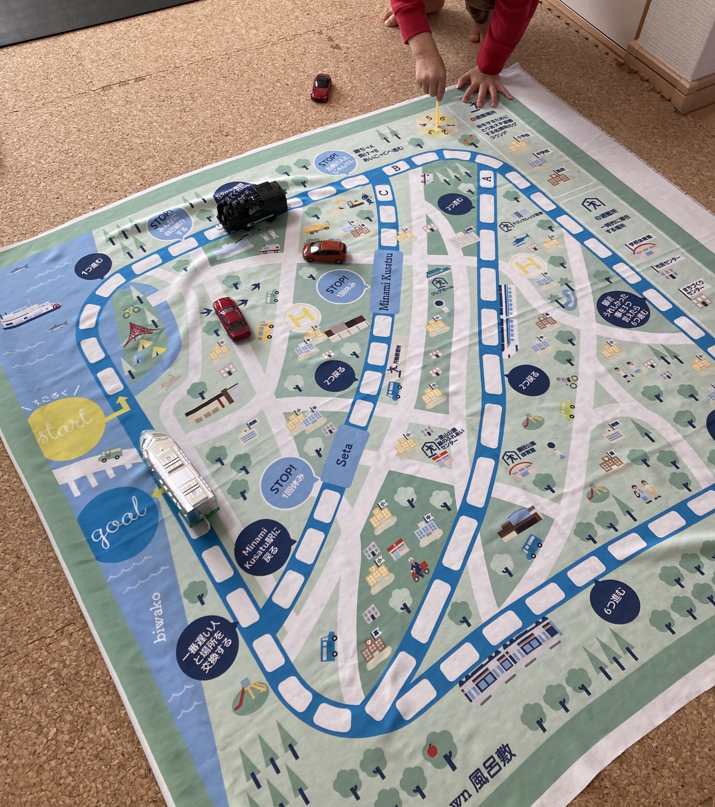 - ミニカーを走らせたり、すごろく遊びをしながら、避難場所がどの辺りにあるのかを話し合ってみてください。
