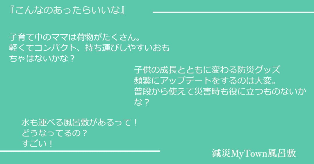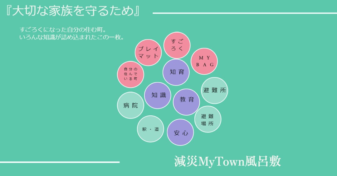 「減災 MyTown 風呂敷」は子育て中の両親が日常的に使うことで、自然と防災 を意識することができ、家族で防災について話すきっかけ作りに役立ちます。
