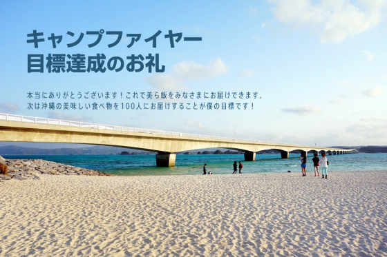 皆様、この度はプロジェクトへのご支援誠にありがとうございました。 36名の方から計254,500円のご支援をいただき、無事目標を達成しキャンプファイヤー成功となりました。 ご支援下さった方はもちろん、FacebookやTwitterでシェアをして下さった方々、 直接応援や協力下さった方々、すべての方々の応援があってのキャンプファイヤー成功だと思っております。 只今、8000円以上のご支援をしていただいたパトロンも皆様には、 「美ら飯」の八月下旬の配送に向けて、全力を上げて準備をしている最中です。 また、「美ら飯」のイベントも行われます。、 キャンプファイヤーの方でも詳細が決まり次第お知らせいたしますので、 楽しみにお待ちください。 皆様、本当にありがとうございました。