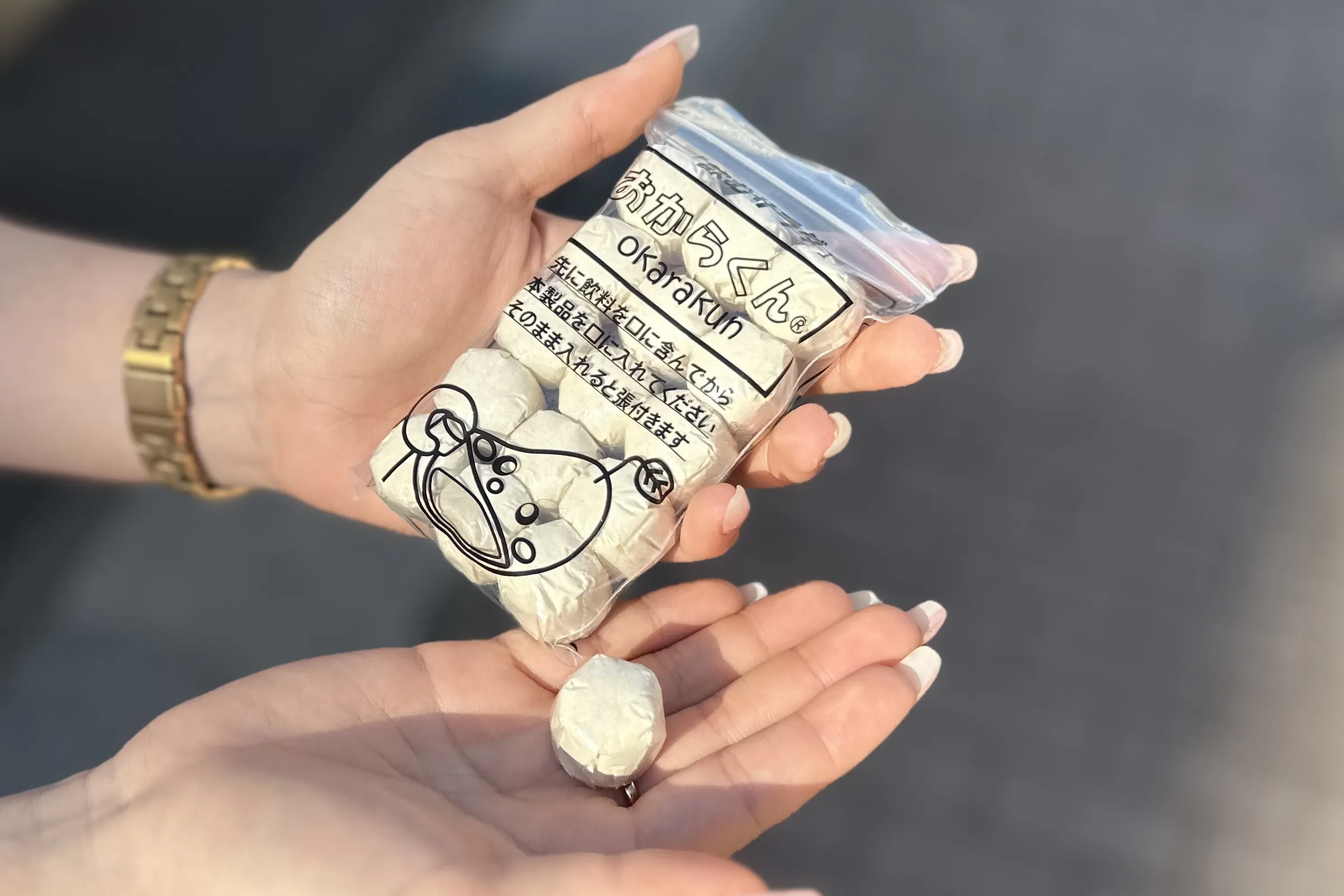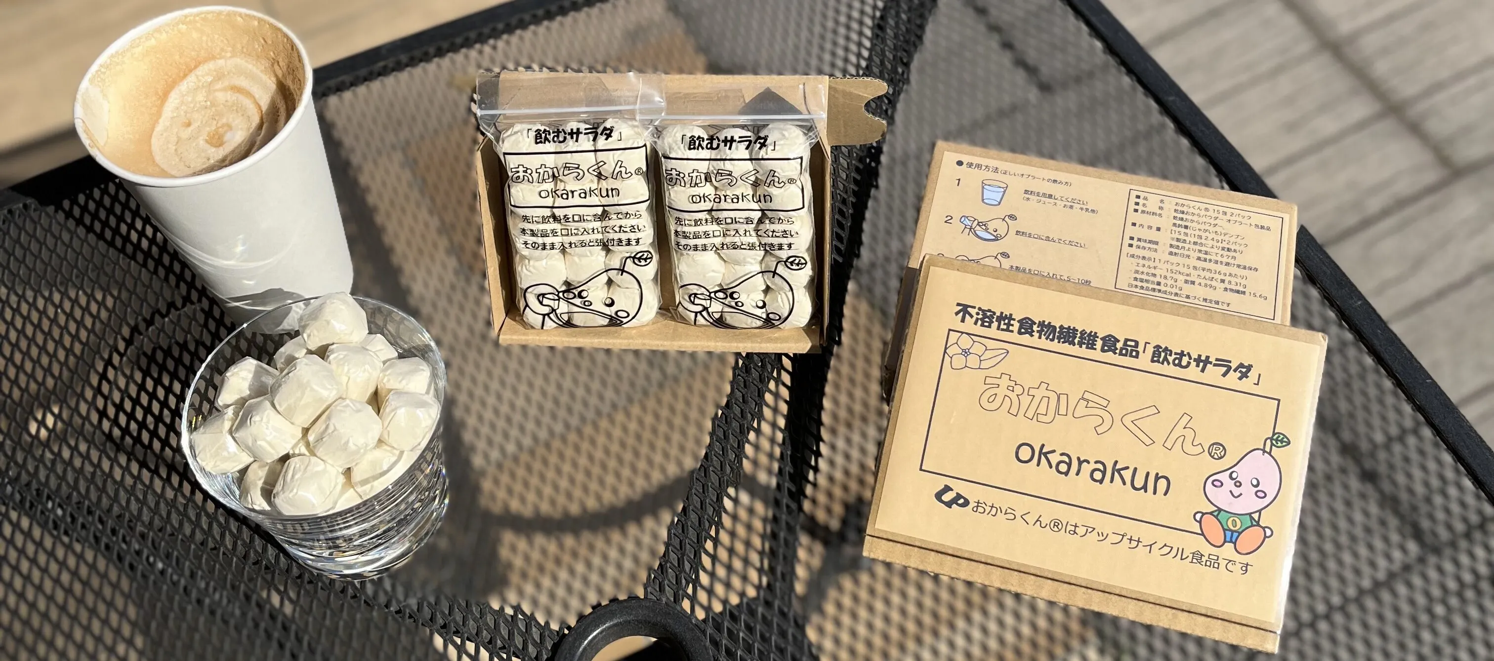 ↑水を口に含んで手元に持った「おからくん®」をそのまま口に入れて飲んでます。可食性フィルムのオブラートで乾燥おからパウダーを包んでいるからそのまま飲めます。これが画期的で特許を取得できた理由です。この大前提の認識が無いとこの後の説明をご理解いただくのは難しいかもと思いましたので、一番最初にご説明しました。
