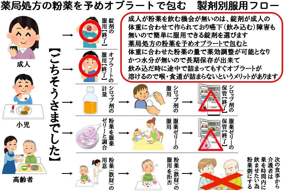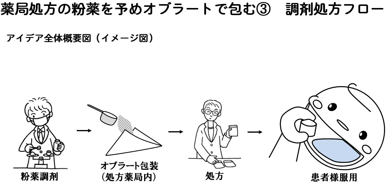10月から本プロジェクトの周知活動でサンプルを配っているのですが、配った先でオブラートを破いて飲もうとして「あり得ないくらいマズイ」と騒ぐシーンを2回立て続けに見ました。40代くらいまでは苦い粉薬や漢方をオブラートで包んで飲んだ経験があると思いますが、シロップ剤やコーティング剤での処方、服薬ゼリーの利用が多くなった現代ではあまり見ることが無いようです。