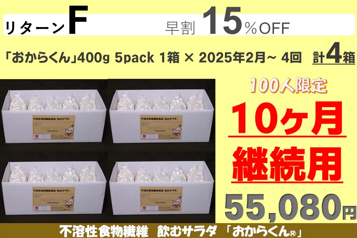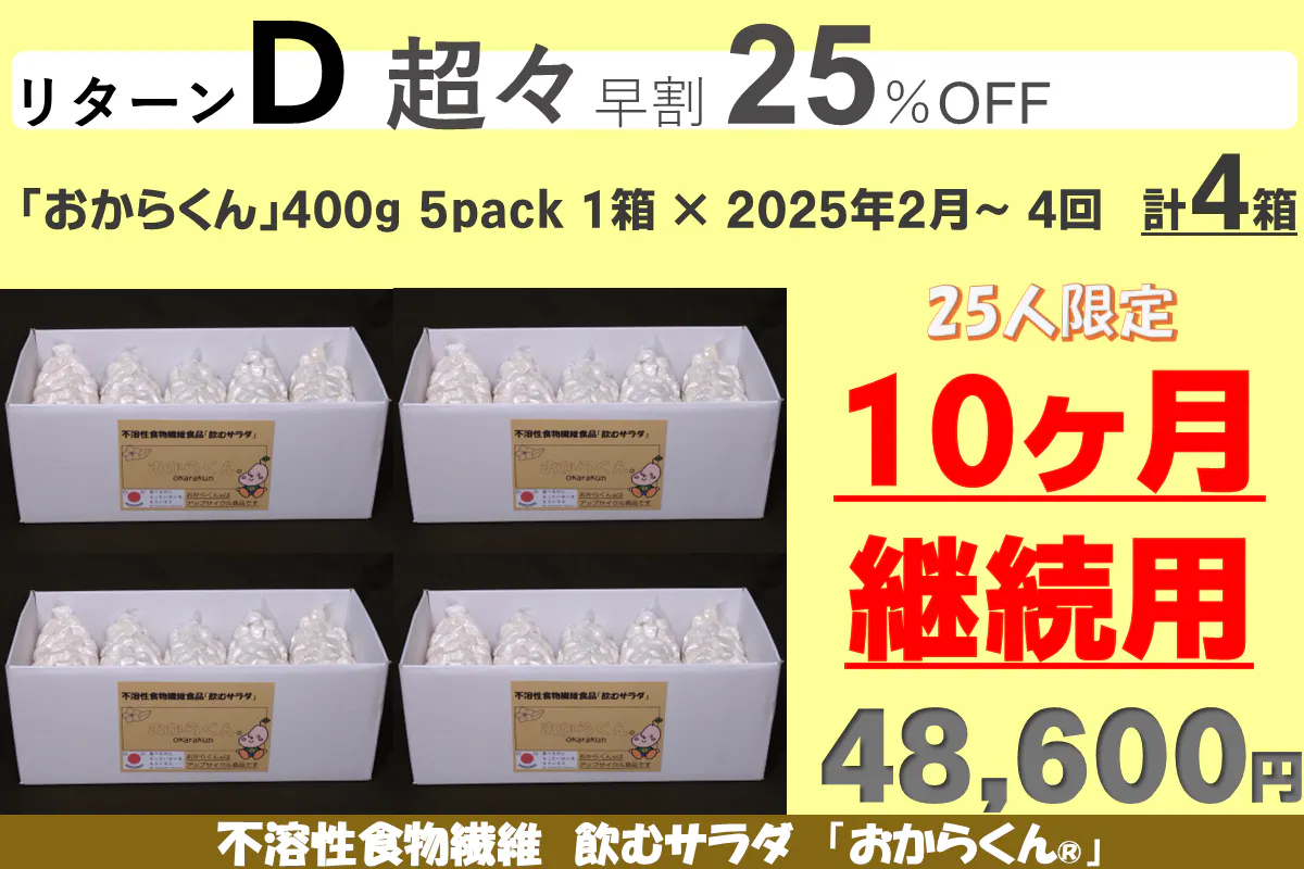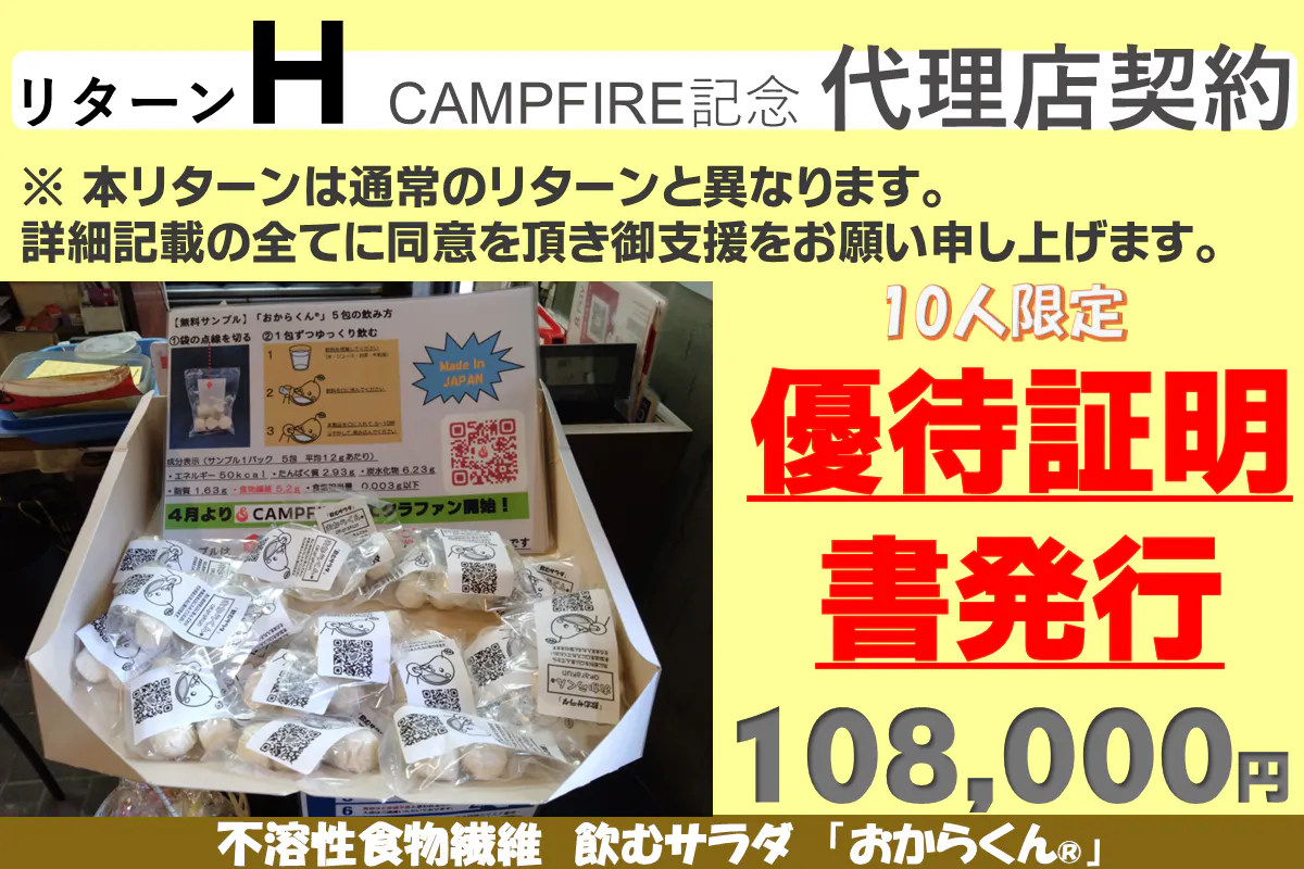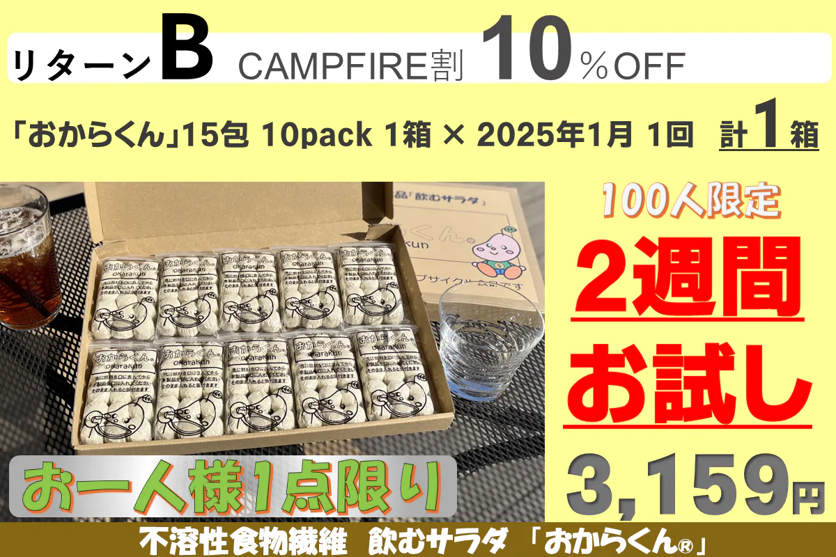 「おからくん®」をゆっくり長く使って身体に負担がないように、またリバウンドしないダイエットを目指して、継続して使い続けて欲しい為に10カ月継続用のリターンに割引を多くしました。リターンA、B、Cはお試し用に用意しましたので「お一人様1点限り」です。重複の支援はご遠慮ください(重複支援が判明した場合は手数料を差し引いて返金します)また御支援を多くいただきますと本リターンの製造発送に集中し、一般販売の再開は見込めないことも予測されますので、「たぶん長く使いそうだな」と思われましたら、リターンD~G(10カ月継続用)の御支援をお願い申し上げます。【11/08にリターンを追加しました】