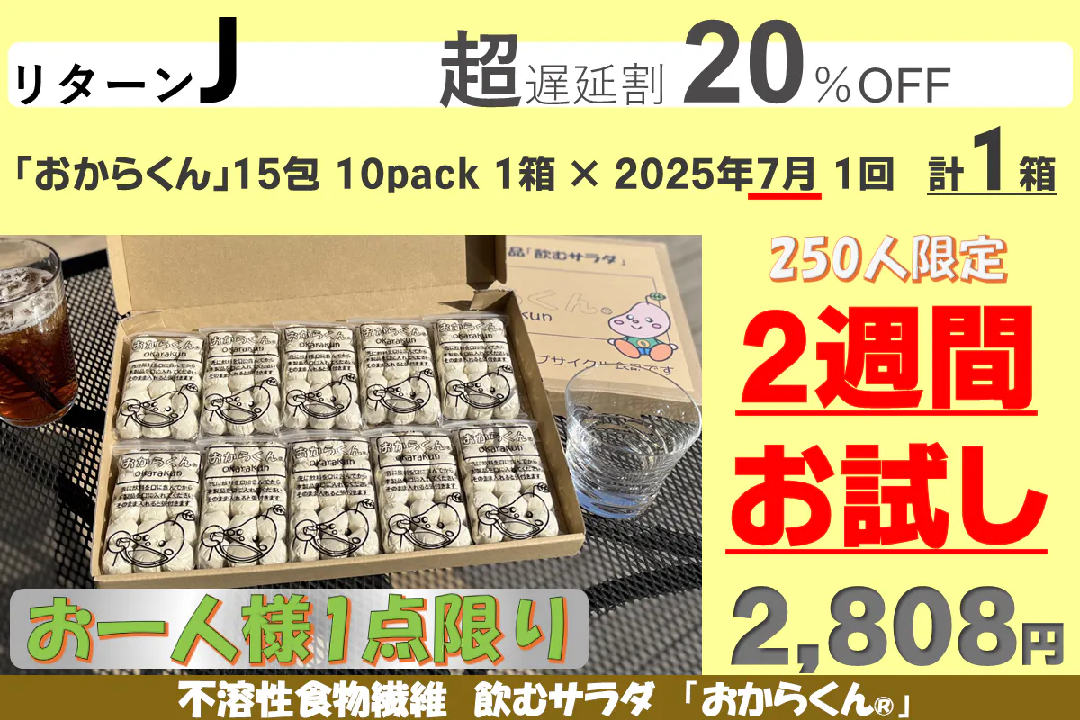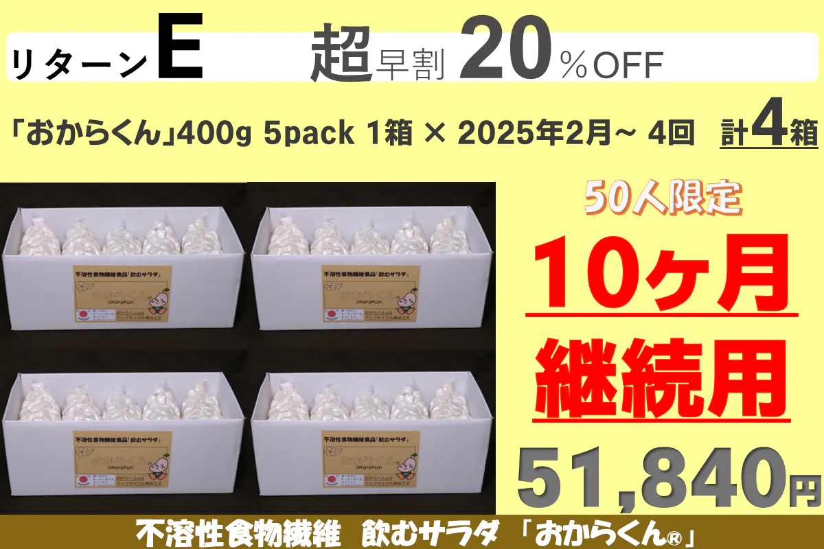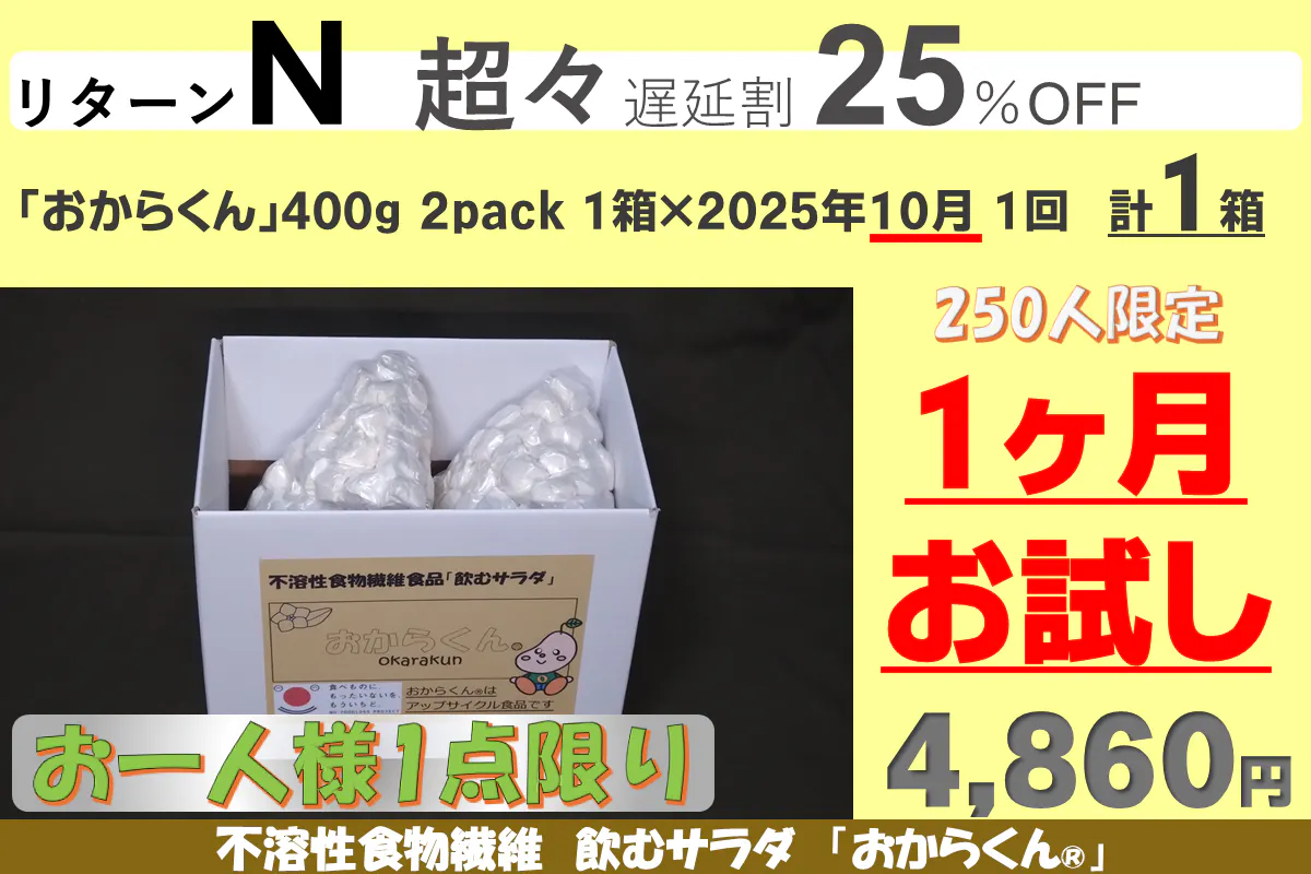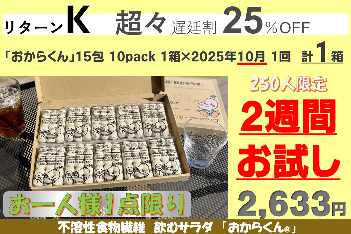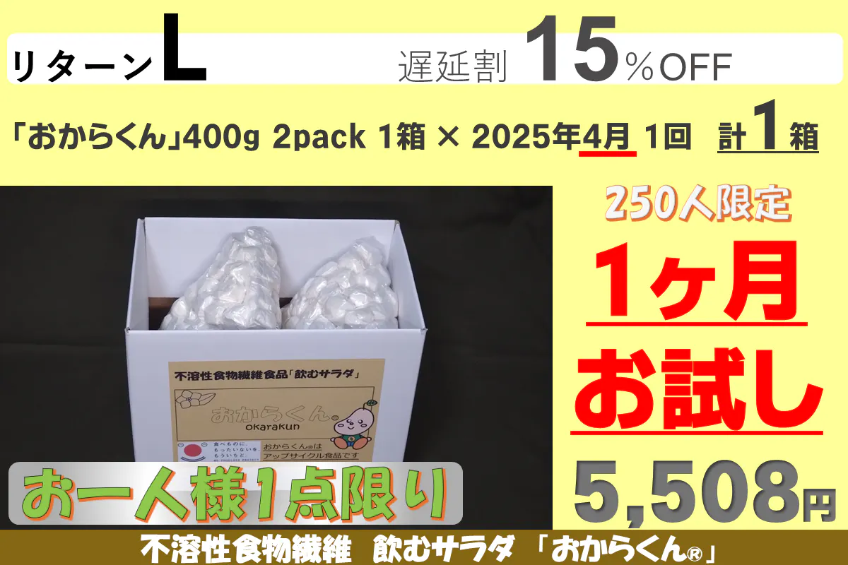 「おからくん®」をゆっくり長く使って身体に負担がないように、またリバウンドしないダイエットを目指して、継続して使い続けて欲しい為に10カ月継続用のリターンに割引を多くしました。リターンA、B、Cはお試し用に用意しましたので「お一人様1点限り」です。重複の支援はご遠慮ください(重複支援が判明した場合は手数料を差し引いて返金します)また御支援を多くいただきますと本リターンの製造発送に集中し、一般販売の再開は見込めないことも予測されますので、「たぶん長く使いそうだな」と思われましたら、リターンD~G(10カ月継続用)の御支援をお願い申し上げます。【11/08にリターンを追加しました】