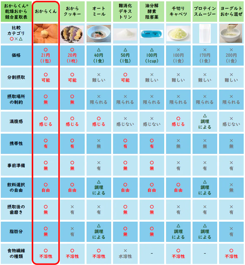 世間一般で「糖・脂質にアプローチ」「お腹が膨れる」「食物繊維を気軽に摂取」「食べて・飲んで健康的に」と言われている食品群と比較表にしました。まさに「おからくん®」しか勝たんという状況です。皆様、ぜひこの機会にお試しください。