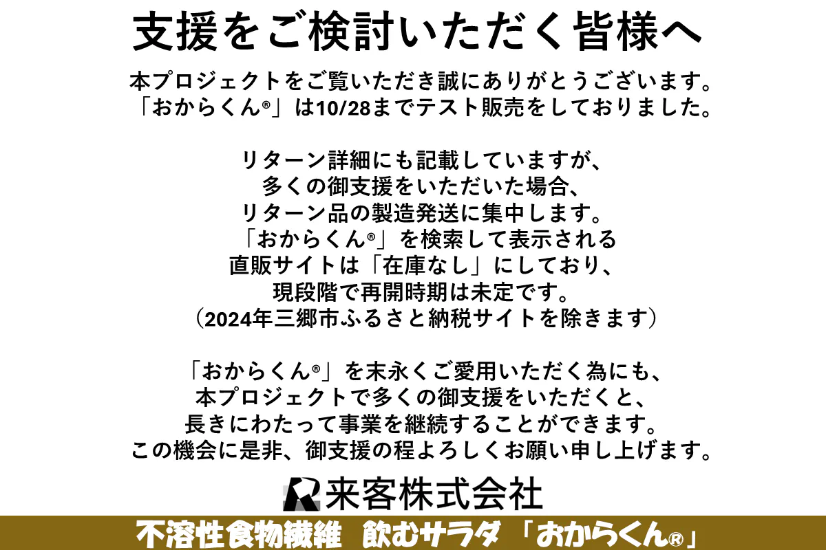 本プロジェクトで皆様から多大な御支援を頂いた暁には、ドラッグストア・コンビニ等の小売店で気軽に「おからくん®」が買えるようになります。その為の第一歩を踏み出すためにも、ご協力をいただけると幸いです。