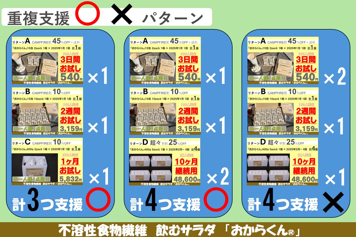 重複支援は「リターンA」「リターンB」「リターンC」それぞれのリターンを複数御支援いただく事が出来ません。