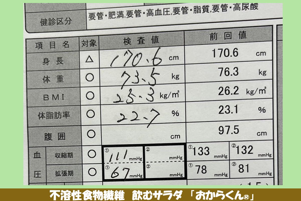本日は弊社出資者様の健康診断の様子をお伝えします。被験者(48歳、男、喫煙者、毎日500mlビール2本以上、通勤時間40分、運動なし)は、出資者ということもあり、本年頭くらいから気づいた時には「おからくん」を飲むようにしていました。といいましても、私のように必死に飲むわけではなくて、飲み過ぎた、食べ過ぎた時に2~3包飲む程度でした。それでこの結果です。血液検査はまだ出てきていませんが、薬も運動もしていないのにこの血圧低下、毎日の生活で変化があったのは「おからくん」を気づいた時に飲むようにしていたことだけだそうです。私も血圧が下がりましたし、何かしら効果があるとは思えてきます。是非皆様にも使っていただいて、状況報告をいただきたいです。今後ともよろしくお願いいたします