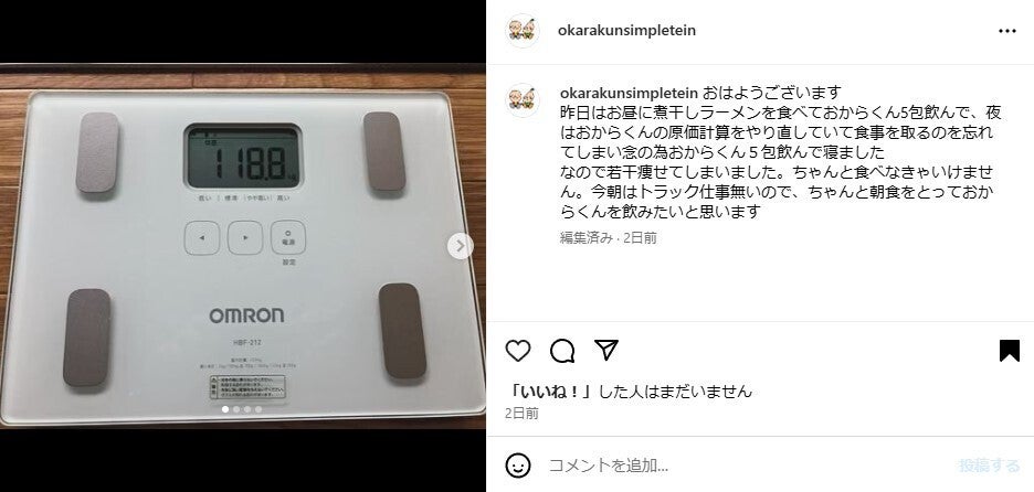 今までは食後に飲んでいた「おからくん®」を食前や食間に飲んで、画像は起床時に体重計を撮影して投稿します。もしよろしければチェックしていただきご納得いただいた上で御支援を賜りますようお願い申し上げます。