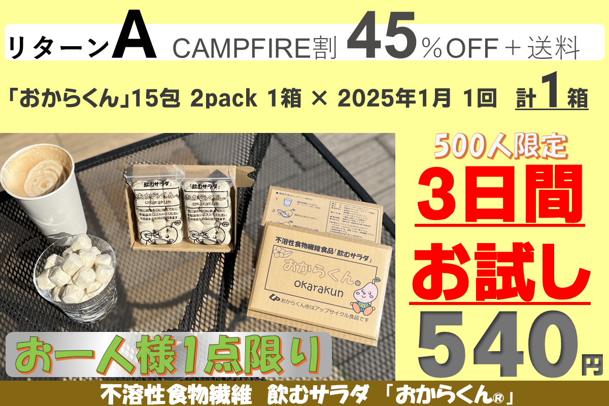 「おからくん®」をゆっくり長く使って身体に負担がないように、またリバウンドしないダイエットを目指して、継続して使い続けて欲しい為に10カ月継続用のリターンに割引を多くしました。リターンA、B、Cはお試し用に用意しましたので「お一人様1点限り」です。重複の支援はご遠慮ください(重複支援が判明した場合は手数料を差し引いて返金します)また御支援を多くいただきますと本リターンの製造発送に集中し、一般販売の再開は見込めないことも予測されますので、「たぶん長く使いそうだな」と思われましたら、リターンD~G(10カ月継続用)の御支援をお願い申し上げます。【11/08にリターンを追加しました】