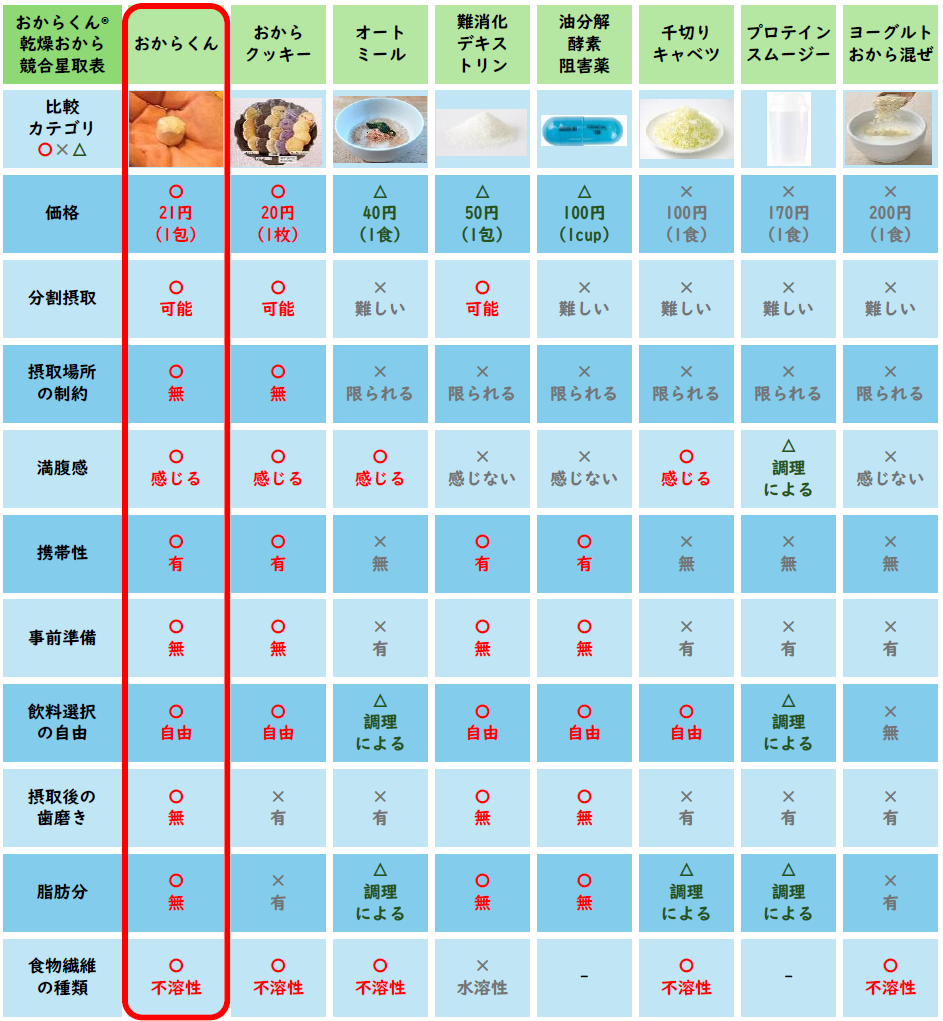 世間一般で「糖・脂質にアプローチ」「お腹が膨れる」「食物繊維を気軽に摂取」「食べて・飲んで健康的に」と言われている食品群と比較表にしました。まさに「おからくん®」しか勝たんという状況です。皆様、ぜひこの機会にお試しください。