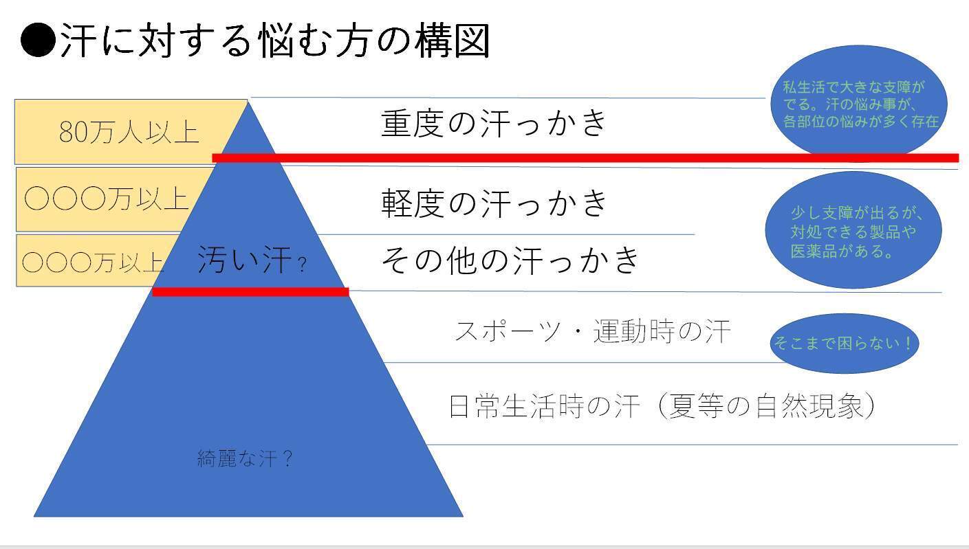 弊社においては、重度の汗っかきさんユーザー(潜在顧客数)、特に重度の汗で悩む人々をターゲットとしており、従来の既製品の提供ではなく、重度汗っかきさん対応の新たな商品提供を行う事があるようで、ないのが現状である。