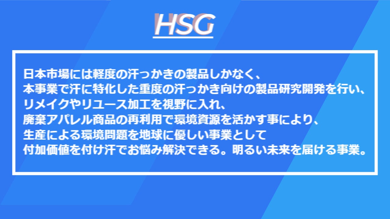 今まで培ってきたファッション的知識とリサーチマインドを活かし、顧客(多汗症疾患者)のことを思いながら顧客に寄り添い商品を開発し提供したい生産者と消費者が喜ぶ事業をしたいという想いから、本事業にチャレンジするに至りました。