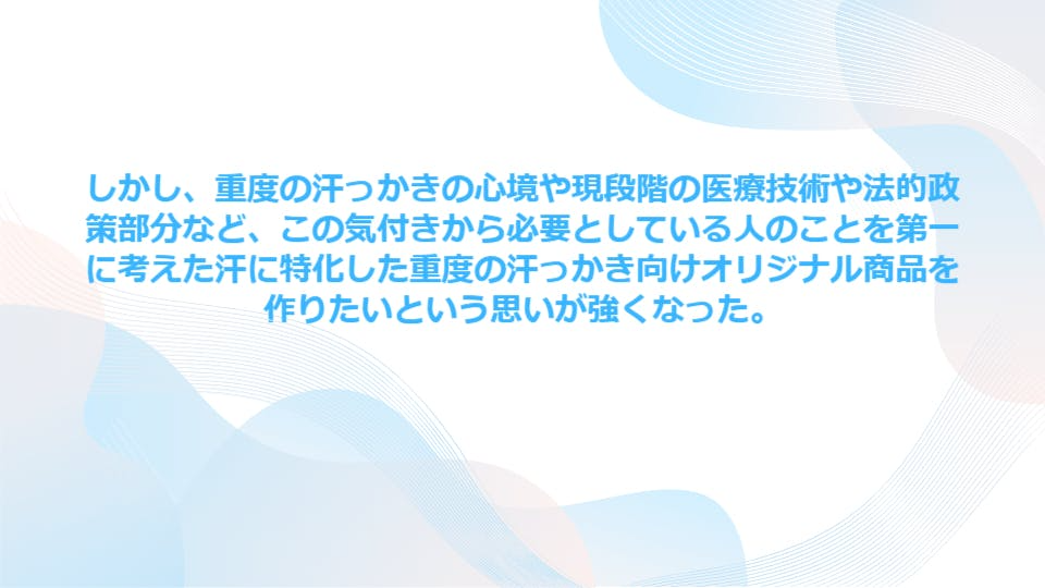 自身も多汗症重度の疾患者であり、汗に特化したアパレル商品や日用品製品の研究開発を今後も行います。