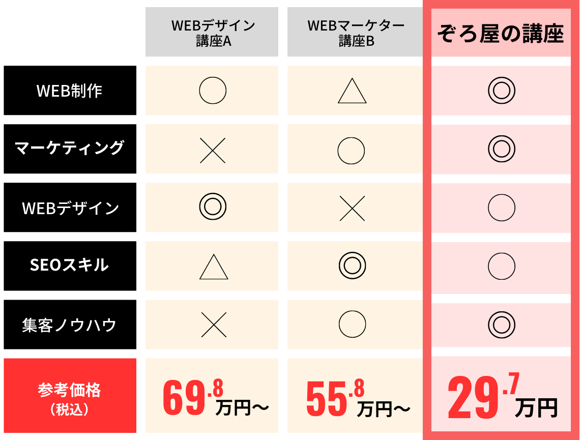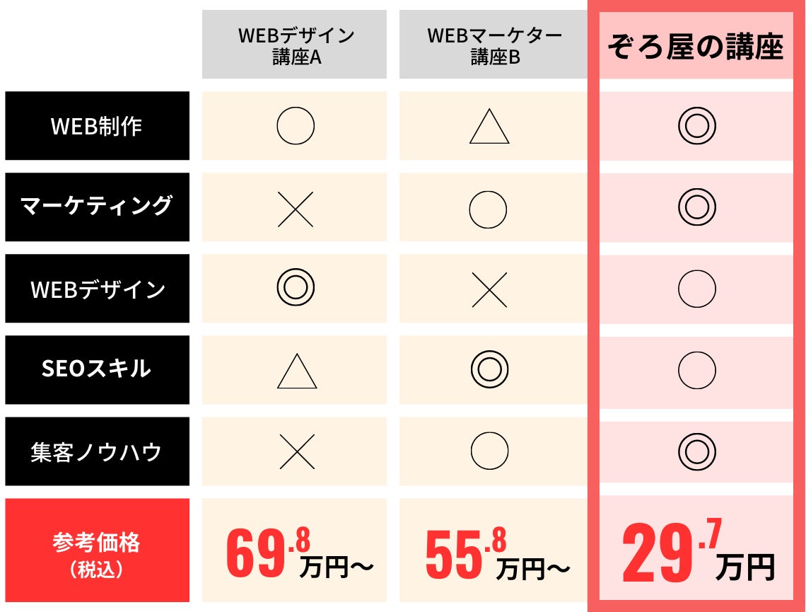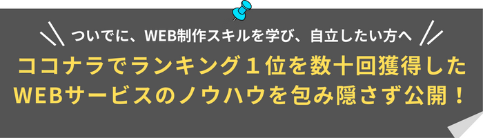 WEB制作という、それだけでは何にもならない偏ったスキルだけではなく、具体的な受注の仕方や、同業他社には絶対に知られたくない独自の集客ノウハウやマーケティング手法も包み隠さず公開しているので、自分でいうのもなんですが、かなり濃密な内容です。集客にすぐに使えるテンプレートや、あっという間に勝てるWEBサイトの土台ができてしまう仕組みもあります。通常のマーケティングやWEBデザインを教える講座では、ここまでの提供はできないはず。