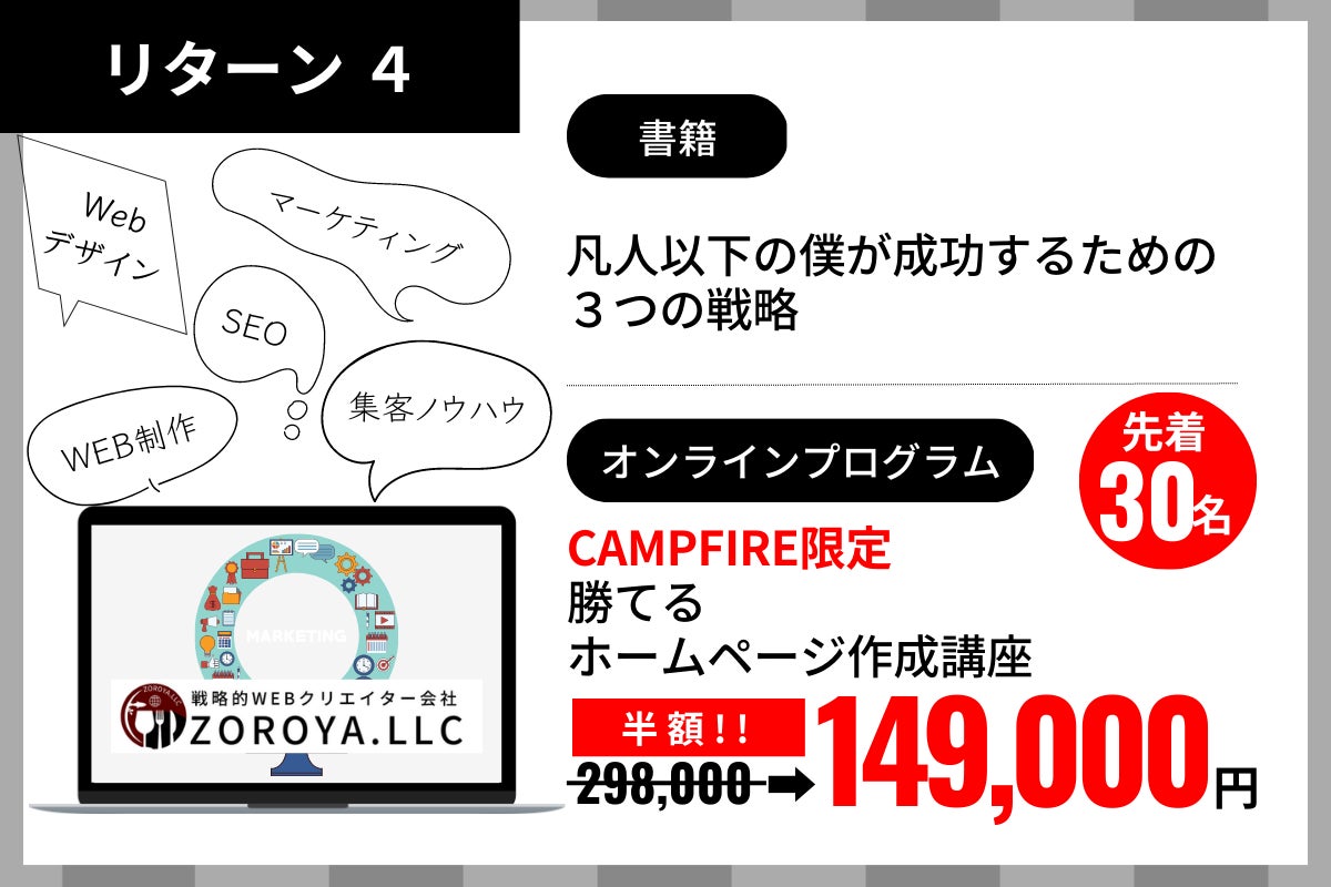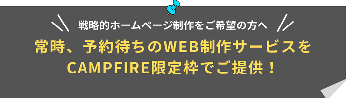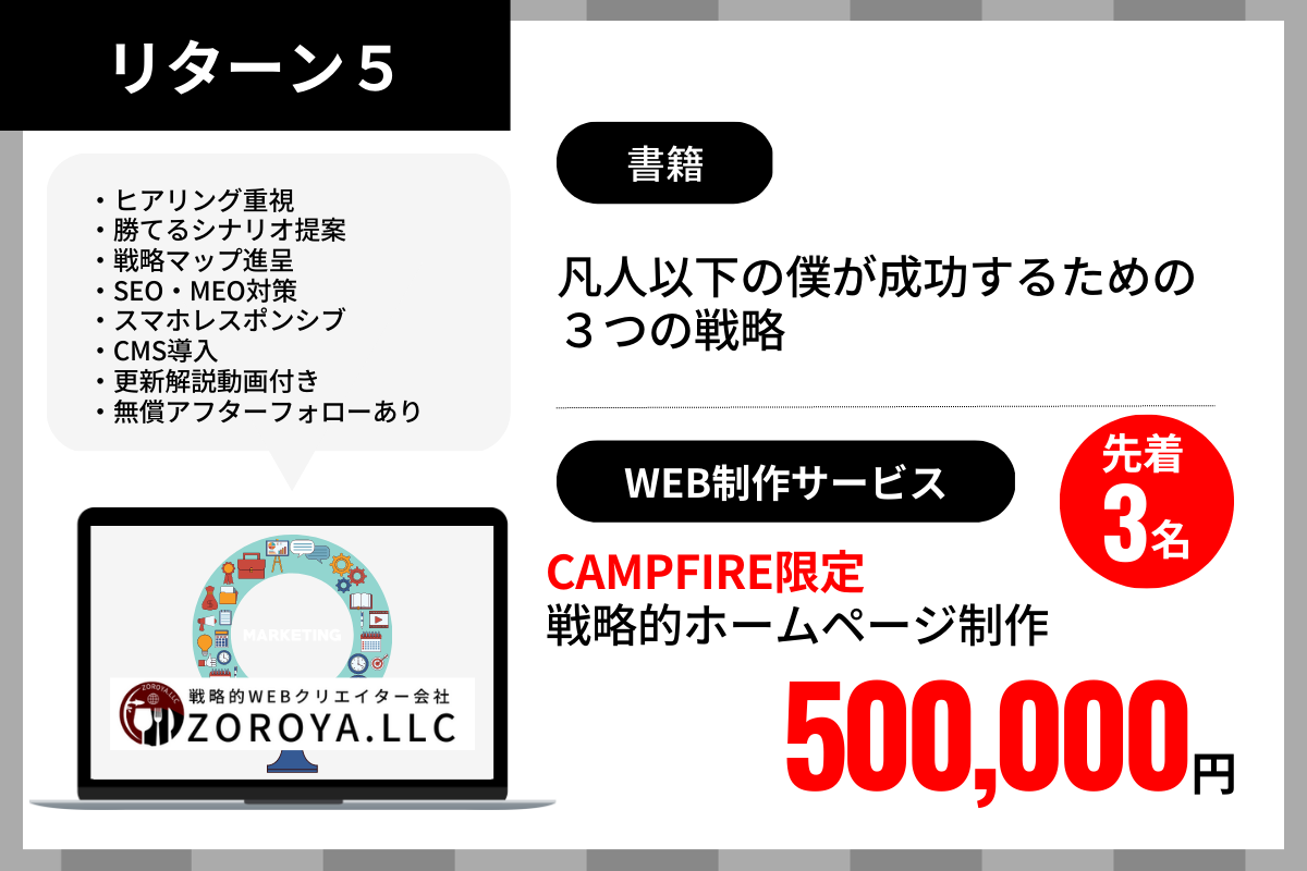 せっかくなので当社のWEBサービスで人気の【戦略的HP制作】を、CAMPFIRE限定枠でご提供することにしました。ココナラでは、提供価格が50万円と同サービス帯の中ではかなり高額にもかかわらず、1万7千件以上のサービスのうち数十回ランキング1位を獲得しています。詳しい内容についてはココナラサービスページをご覧ください。