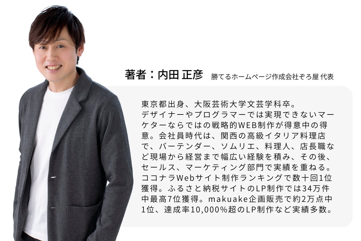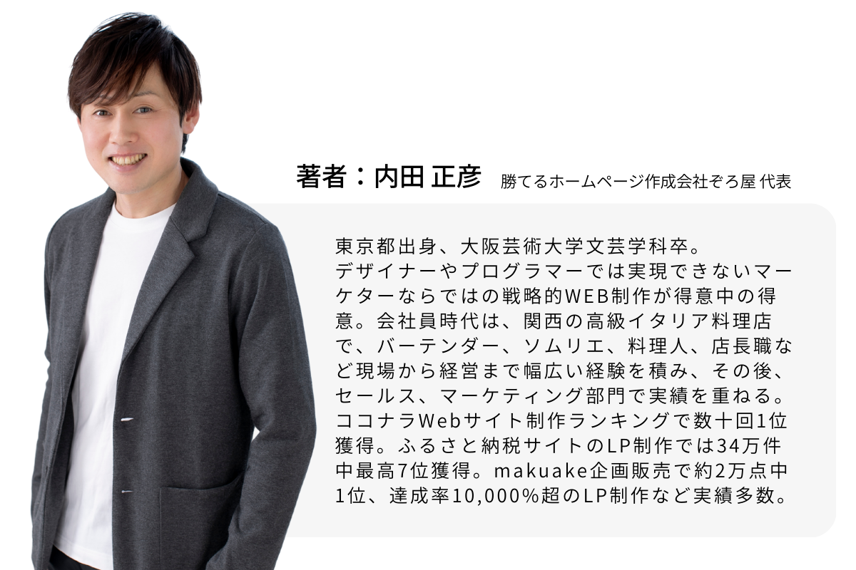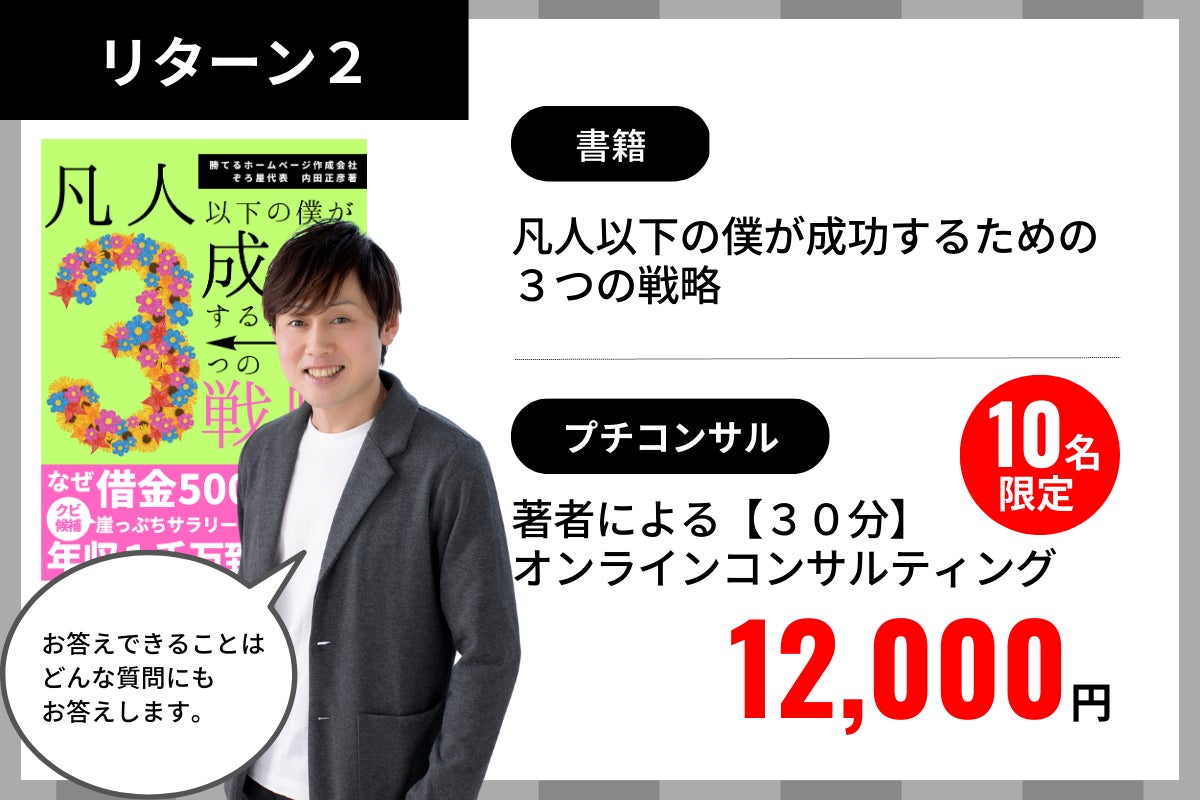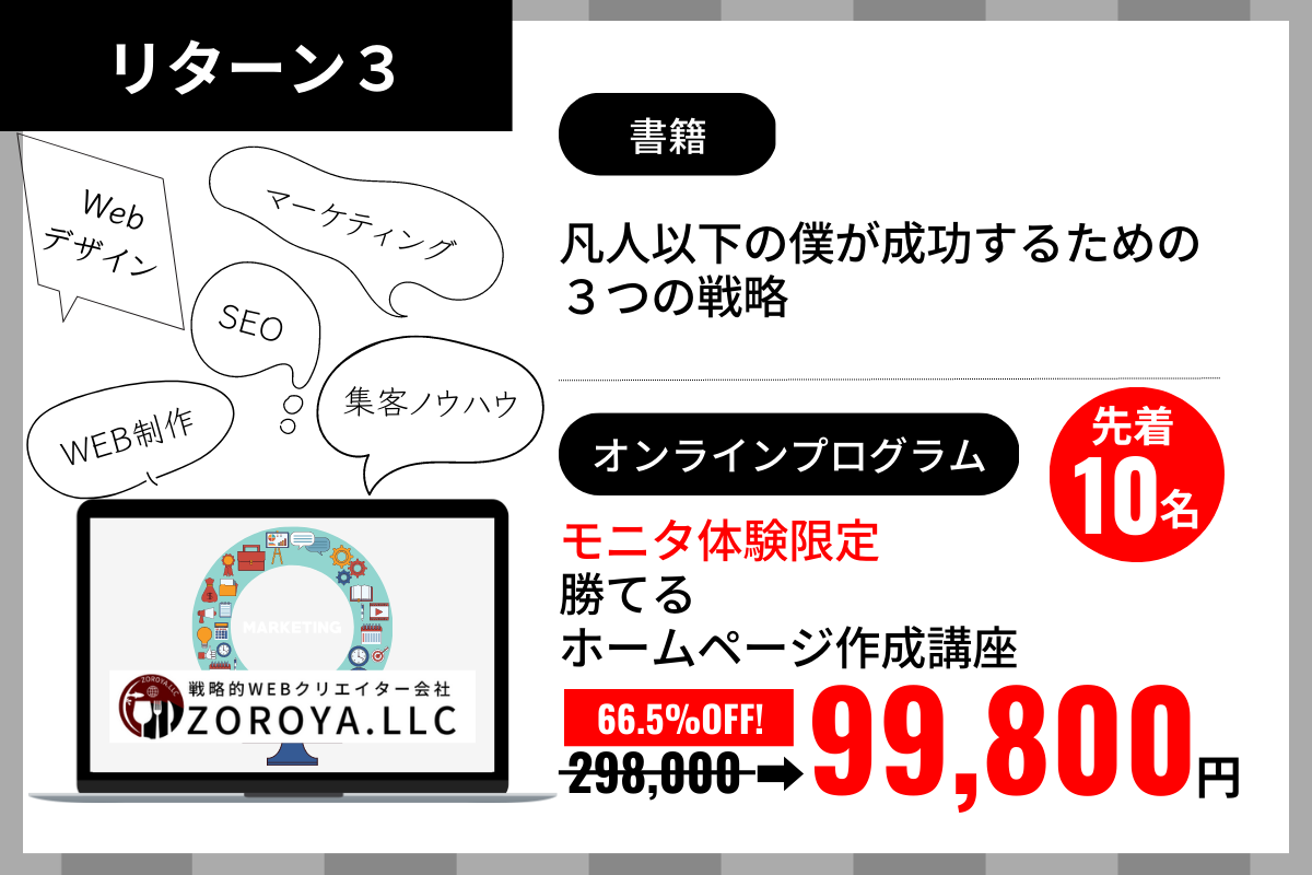 この講座は、あまりに秘匿性が高いので、これまで大々的にしてきませんでした。そのため、まだ実践者が多くありません。そこで、書籍出版を機に、モニタ体験を募集することにしました。【勝てるホームページの作り方講座】を学んでいただき、その体験談をインタビューさせていただくこと(※顔出しOK)を条件として、通常29万8000円で提供しているプログラムを、9万9800円でお試しいただきたいと思います。もちろん、書籍もお付けします。ただし、10名様を上限とさせてください。