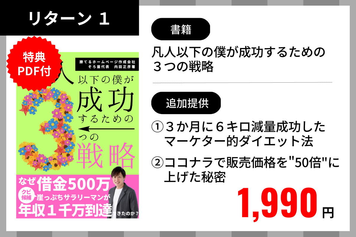 ご支援いただいた方には、価格以上のリターンをお届けしたいので、書籍の発送だけでなく、商業出版では内容的に収録できなかった【3か月に6キロ減量成功したマーケター的ダイエット法】(PDF)と【ココナラで販売価格を50倍に上げた秘密】(PDF)を追加提供させていただくことにいたしました。いずれも<3つの戦略>が核となっているので、書籍と合わせてご覧いただくと、よりノウハウを理解しやすくなるだけでなく、考え方を応用すればビジネスで効果的に成果を上げることができると思います。