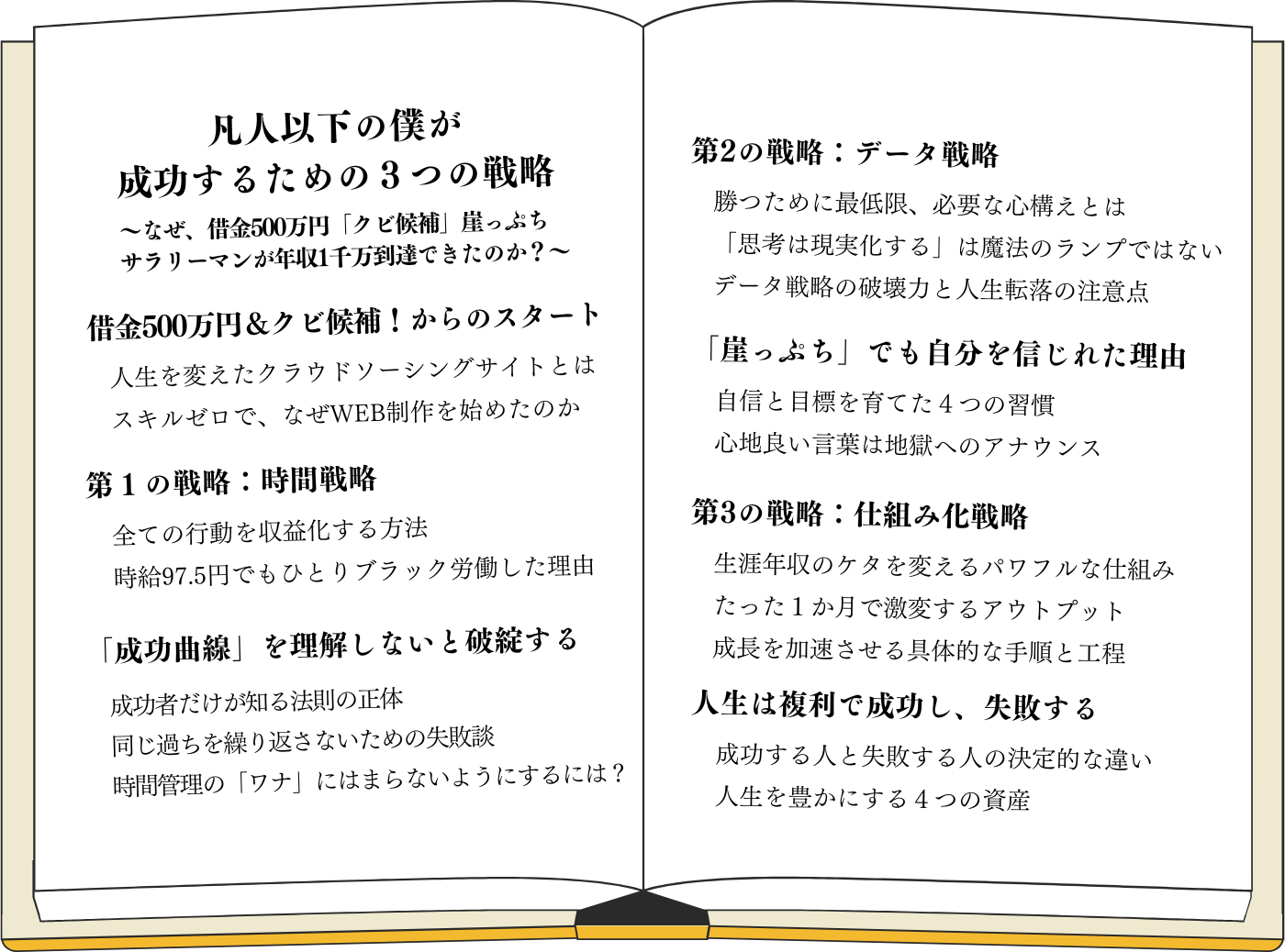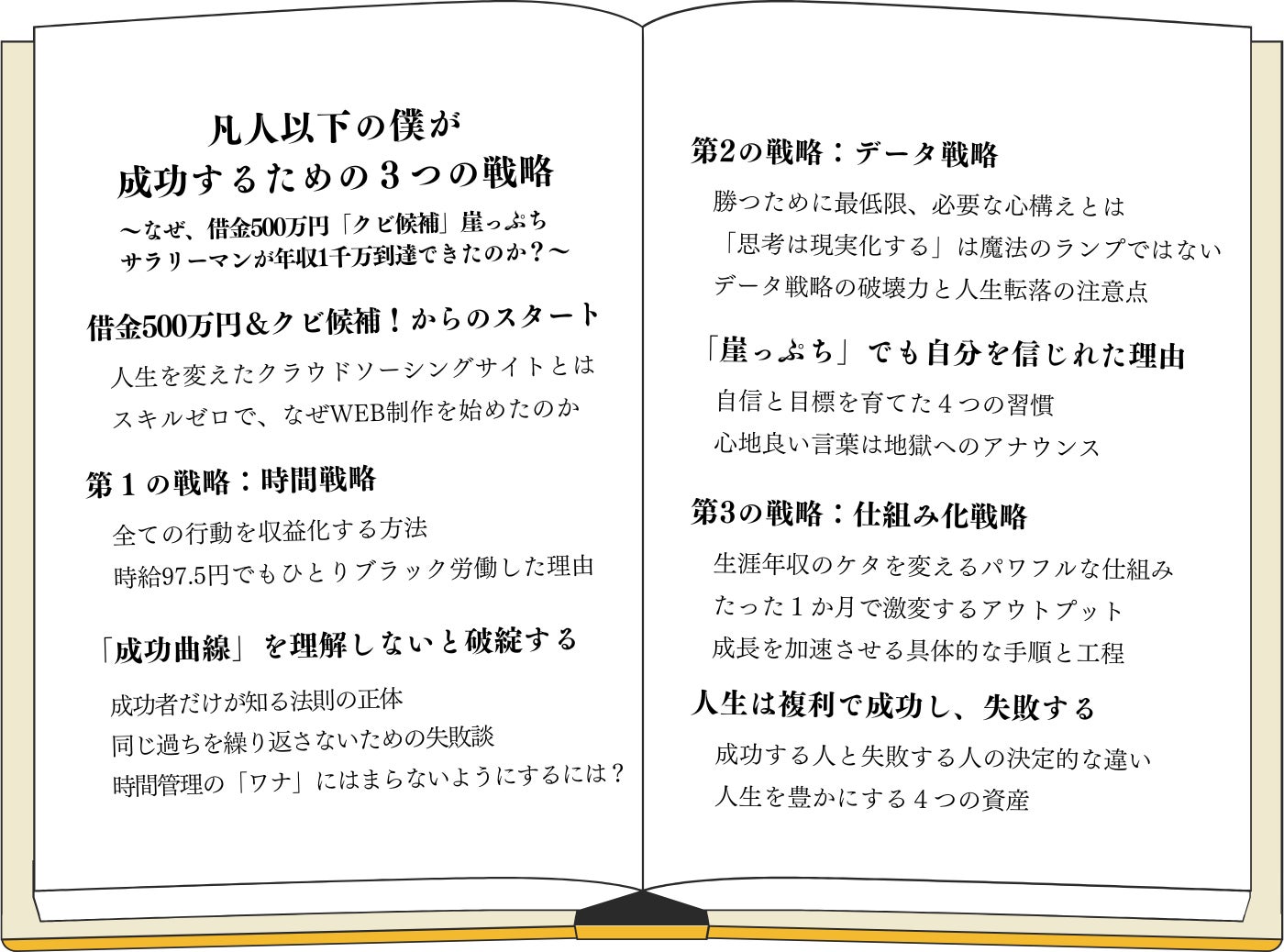 この本では、そうして得た学びや、実践を自分なりに仕組み化して、10年前の借金だらけの僕でもすぐに実践できるよう、図も交えながら、解説しました。ですから、3つの戦略の中には、これまで出会った、上司、お客様、同僚、友人、そして、たくさんの先人たちの知恵も詰まっています。