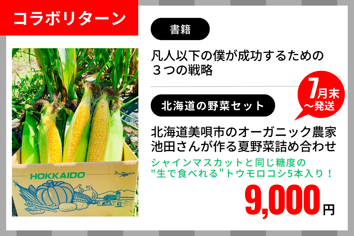 高級シャインマスカットと同じ糖度の「オーガニックとうもろこし」が5本と夏野菜の詰め合わせ+拙著『凡人以下の僕が成功するための3つの戦略』のセットになります。この「トウモロコシと旬の野菜の詰め合わせ」は当プロジェクトのために池田さんが特別に用意してくれました。もちろん、当社に利益は入りません。ですので、野菜だけでも価値があります。