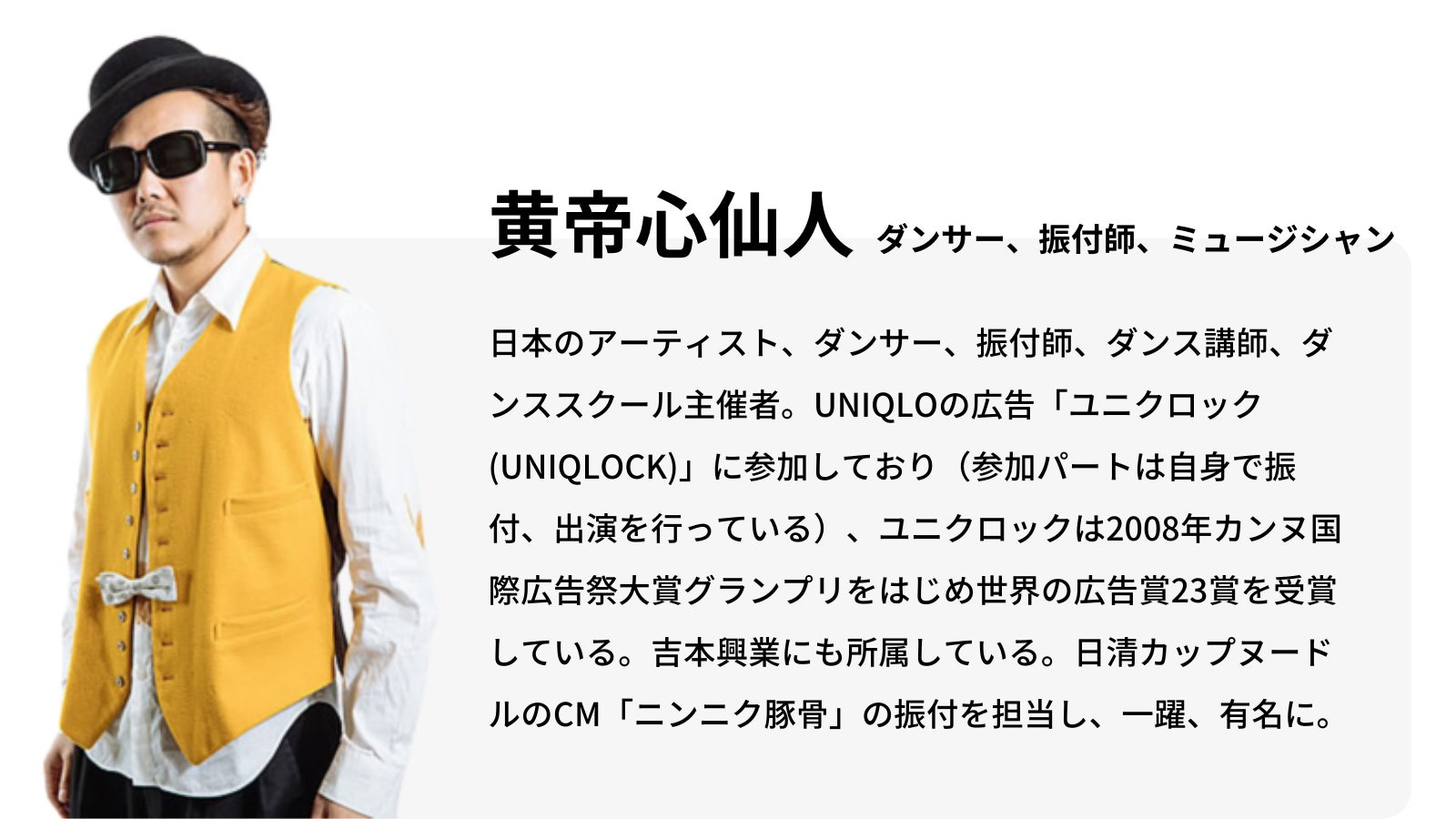 仙人さんの率いるダンスパフォーマンスチーム「タイムマシーン」は、ジョージ・ルーカスが世界で初めてスター・ウォーズ公認のダンスパフォーマンスとして認めるなど世界的な活躍をされています。仙人さんはもともとプロサッカー選手を目指していたそうですが、足首のケガで断念せざるを得なくなり、その後、出会ったダンスでプロを目指すもケガの影響で足を激しく動かせませんでした。しかしそれを逆手にとって、上半身の各部分を単独で動かすトレーニング「アイソレーション」で世界的なプロダンサーに上り詰めた人です。
