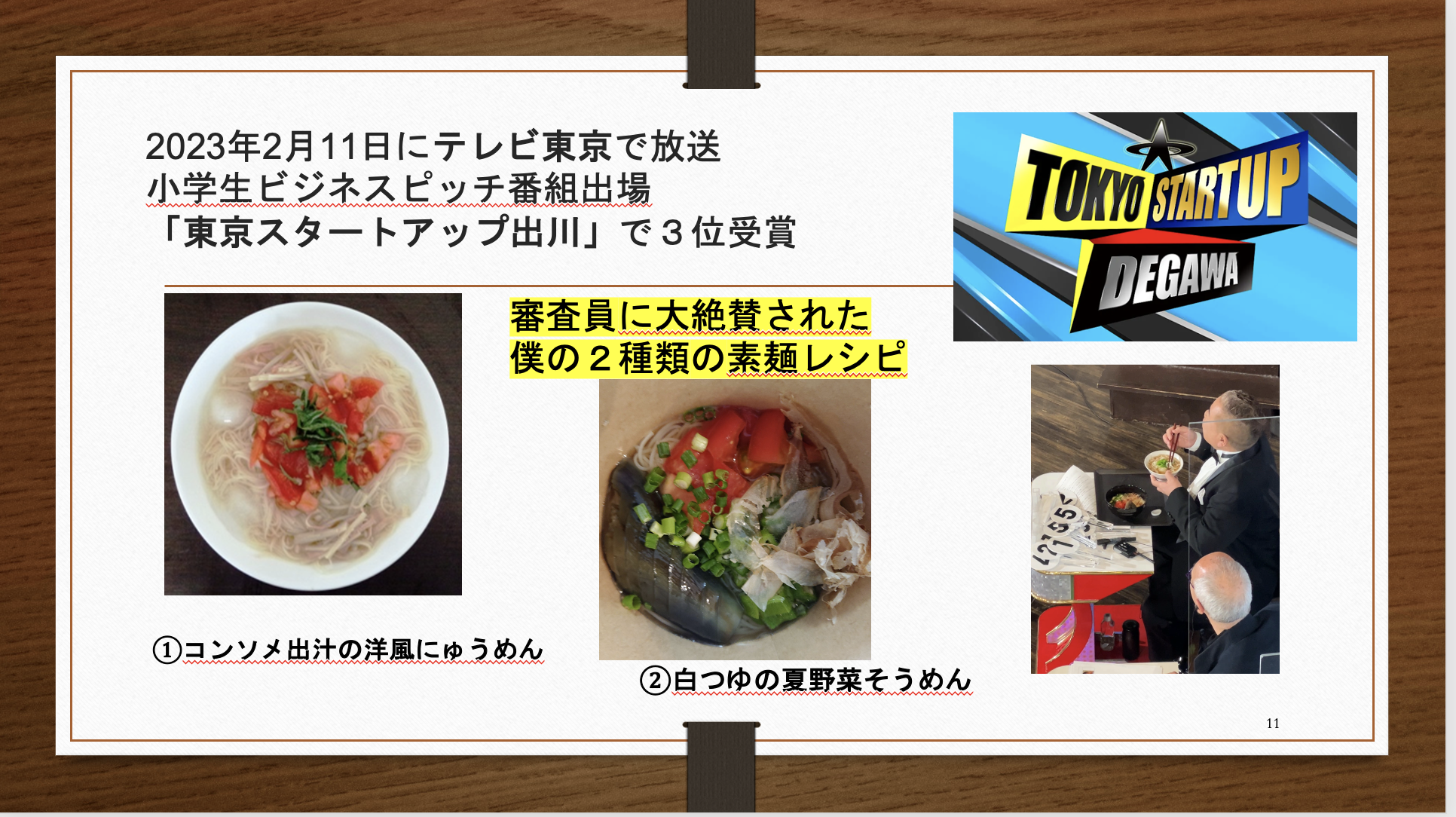 2023年2月11日に放送されたテレビ東京「スタートアップDEGAWA」という小学生のビジネスピッチ番組に出場し、ぼくのそうめん「コンソメにゅうめん」「夏野菜のそうめん」の2種類を審査員に食べてもらい、とてもおいしいと完食してくれました。
