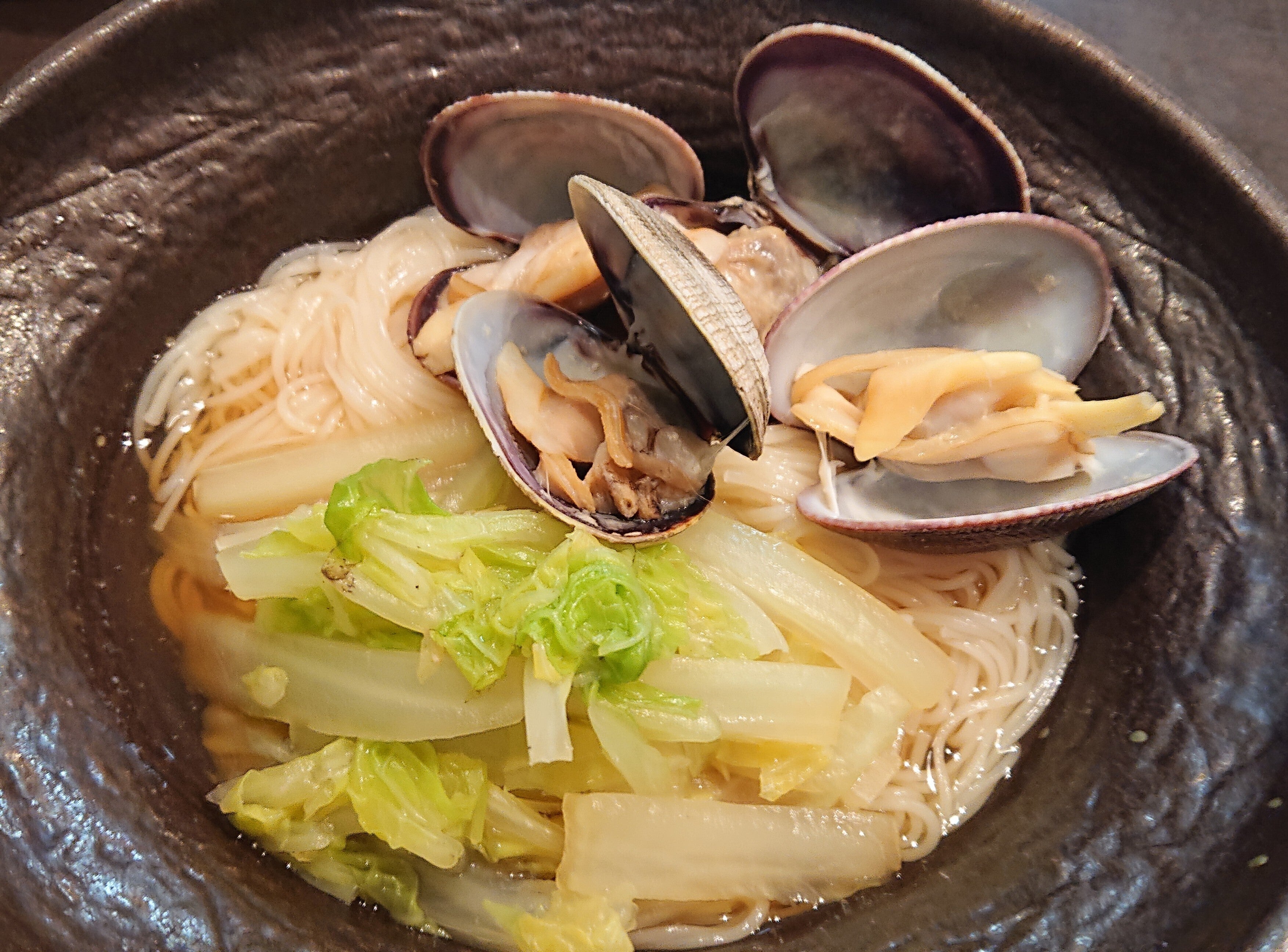 北海道厚岸産のあさりそうめん、大きいあさりの出汁がしみた白菜の細切りとそうめんが美味しいです。