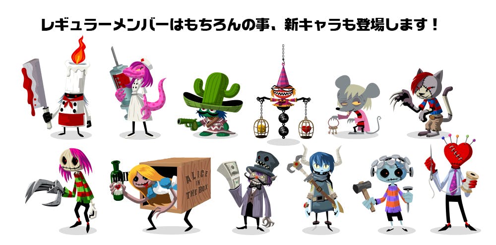 今回のゲームは、グレゴリーホラーショーのキャラクターを、原作者のイワタナオミが、怖いけれどキュートな2Dキャラに新たにリデザインします。さらに、ゲームには、ダークだけど魅力的な新キャラも多数登場します。