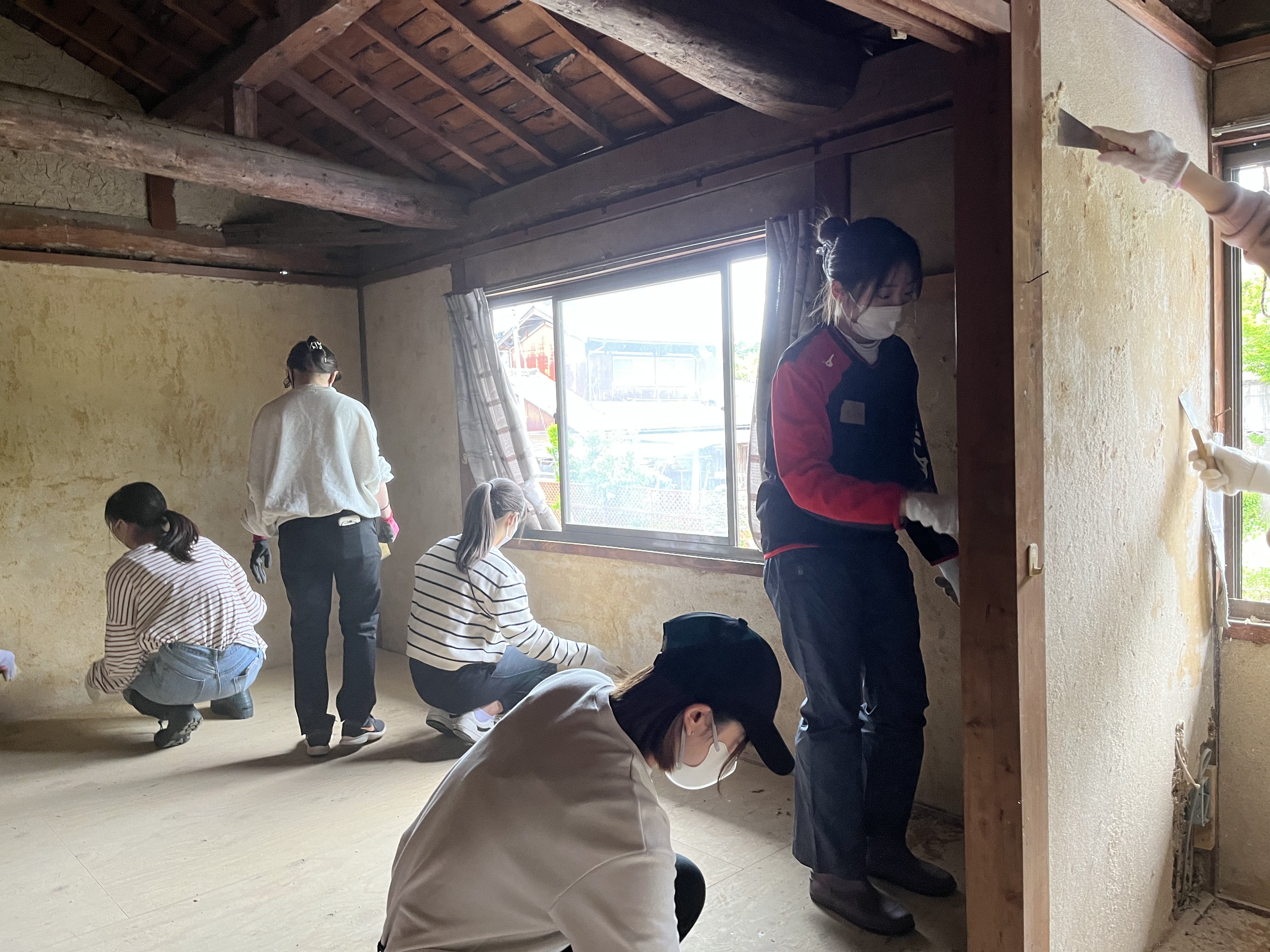 先日学生のみんなにも解体作業の壁紙をはがすお手伝いいただきました。