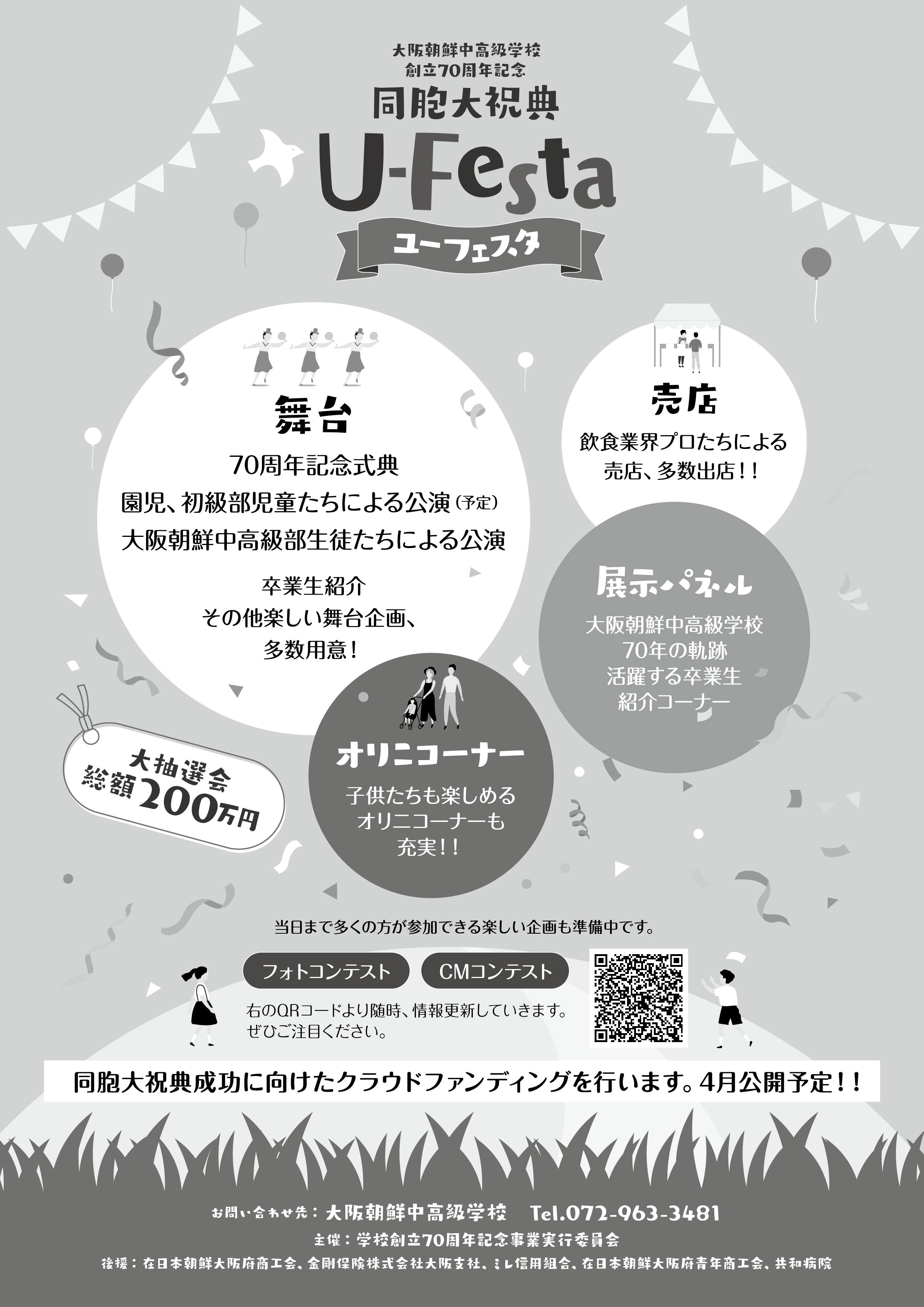 『ウリ青春の学び舎でともに集い、祝おう。誇り、歌おう。ウリ未来の学び舎でともに語らい、笑おう。明日を望もう。』今一度懐かしい顔に会うべき、懐かしい青春時代を思い起こすべき、『創立70周年記念式典・同胞大祝典 U-Festa ユーフェスタ』にてお会いしましょう。『同胞社会唯一無二のコミュニティである母校が、卒業生たちの数多い参加を心から願っています。