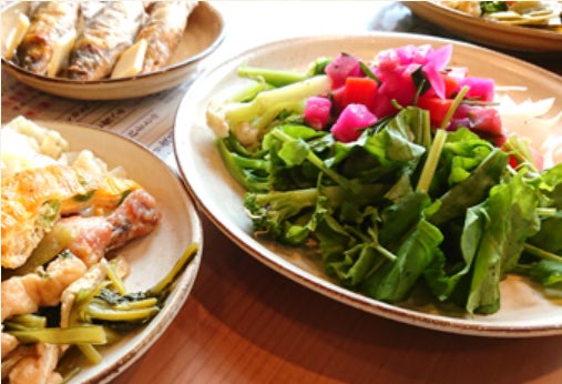 2016年には廃園となった幼稚園を改装した農家レストラン「且緩々(しゃかんかん)」を開業。四方を囲む自然を眺めながら、地元の農家のみなさんが作る旬の食材をふんだんに使った料理を提供しています。