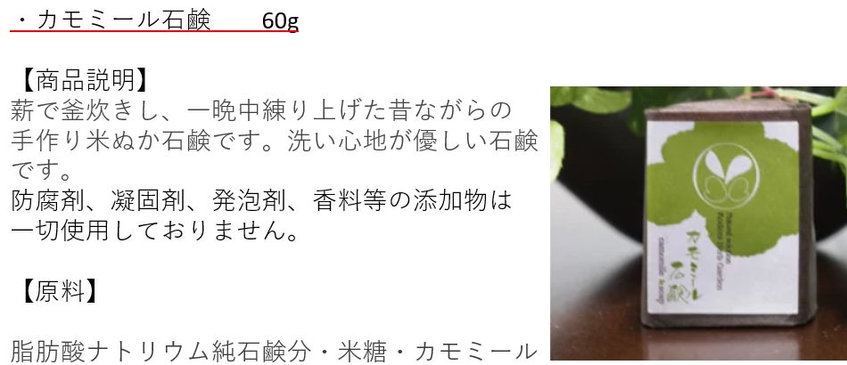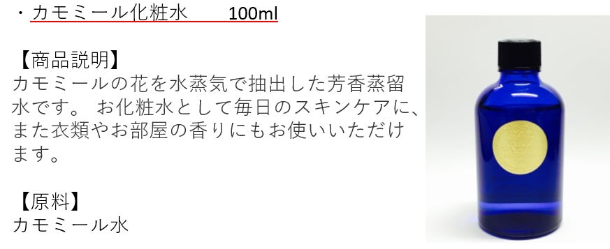 ここ山之内地区で収穫したカモミールで作る化粧水には、ビサボロール(美白、抗炎症効果があるとされる成分)がドイツやフランスのカモミール化粧水より4~5倍多いことが姫路獨協大学薬学部の研究でわかりました。