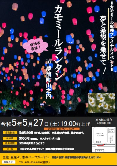 2023/04/24 11:12支援者の皆様カモミール花摘みイベントの終盤、5月27日(土)にスカイランタンのイベントを開催いたします。参加希望をメール等で頂ければお支払いは当日で構いません。参加お待ちしています!スカイランタンは天候次第では中止があり得ます。その時は前もってご連絡いたします。スタッフ一同 もっと見る