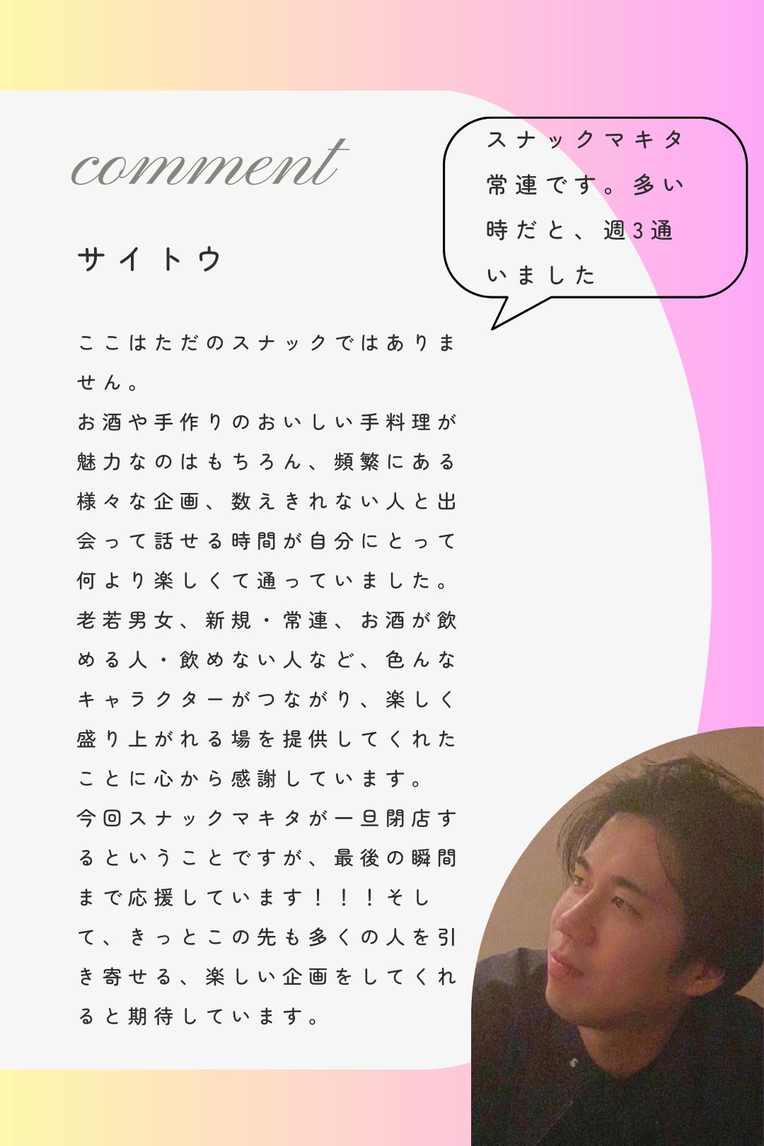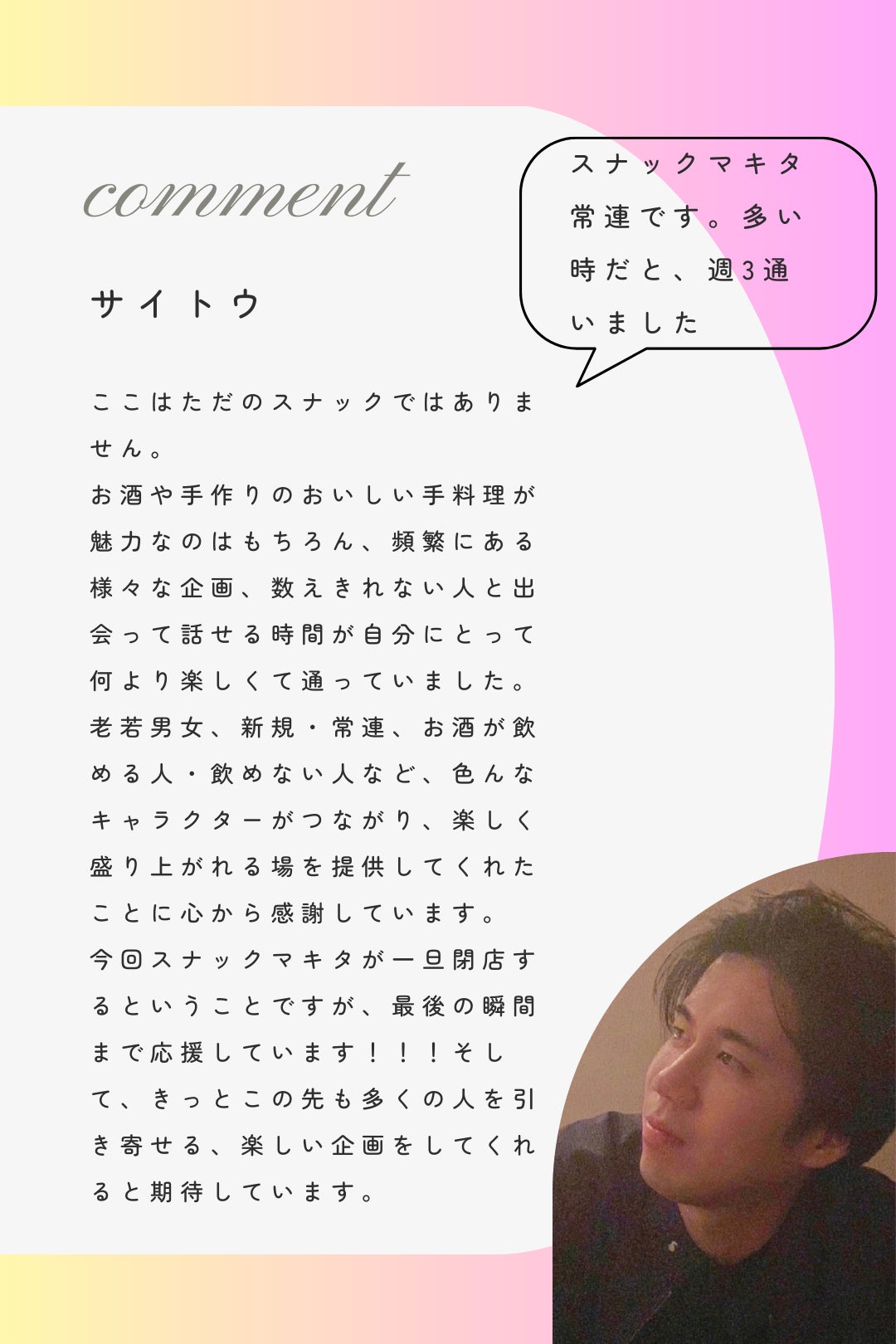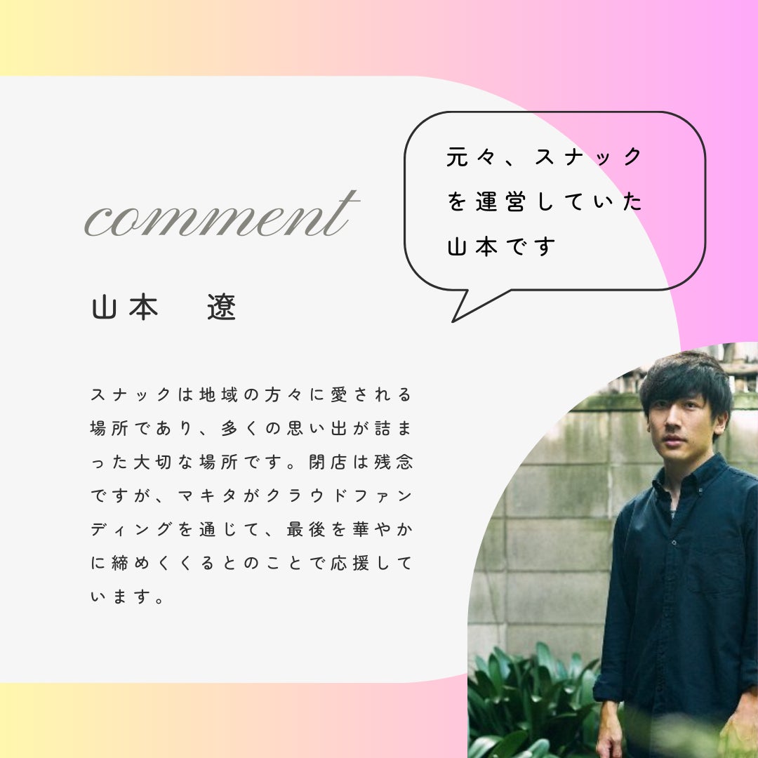 これまでスナックマキタに関わってくださった方から、応援コメントをいただきました。